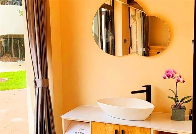 全景落地窗,向自然取景,客厅空间宽敞明亮,落地窗保证了充足的采光,窗外的蓝和室内的绿又给人足够的清凉,浴室内提供拖鞋、24小时热水和吹风机,让您感受到宾至如归的享受。