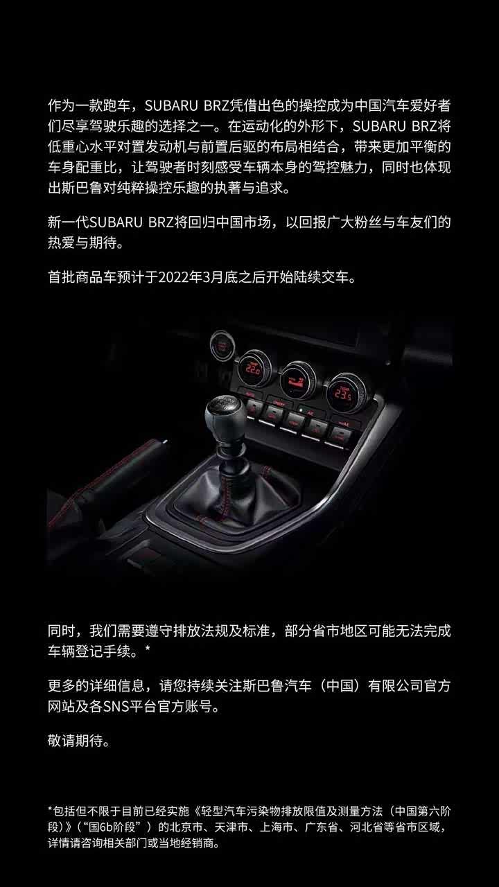 这两天斯巴鲁官方正式公布新一代BRZ将会重返中国市场,并于2022年3月底开始陆续交付用户。不过,对于北京、上海、广东省以及河北省部分地区的消费者来说,新一代BRZ仍因排放原因无法在这些实行国六b排放标准的地区上牌。