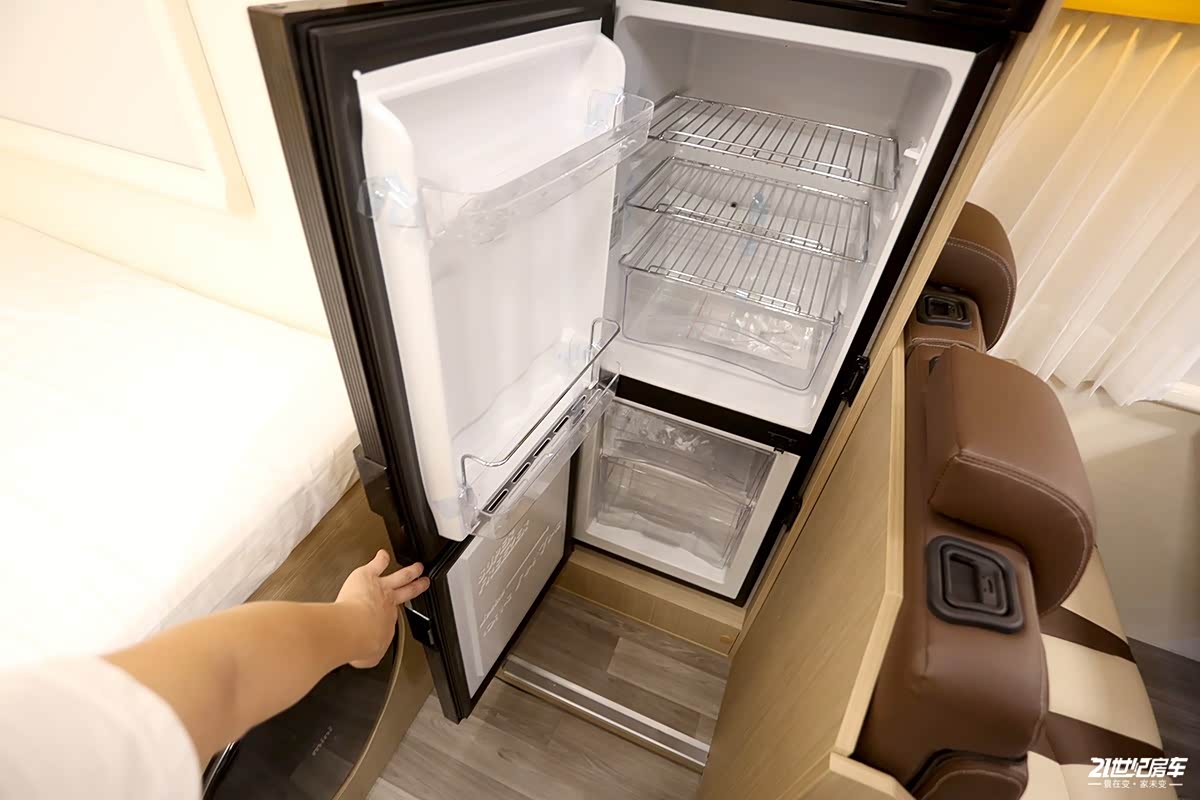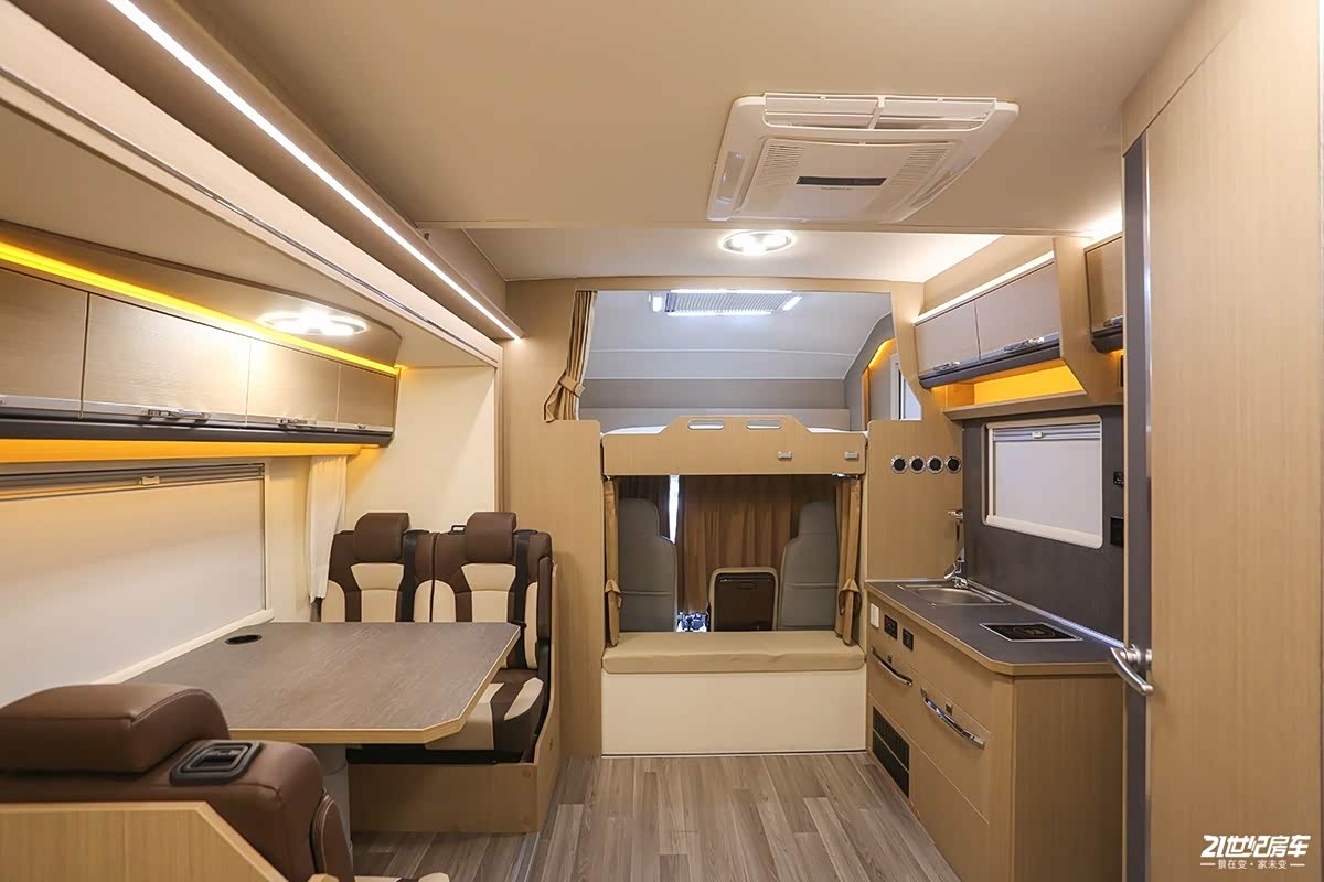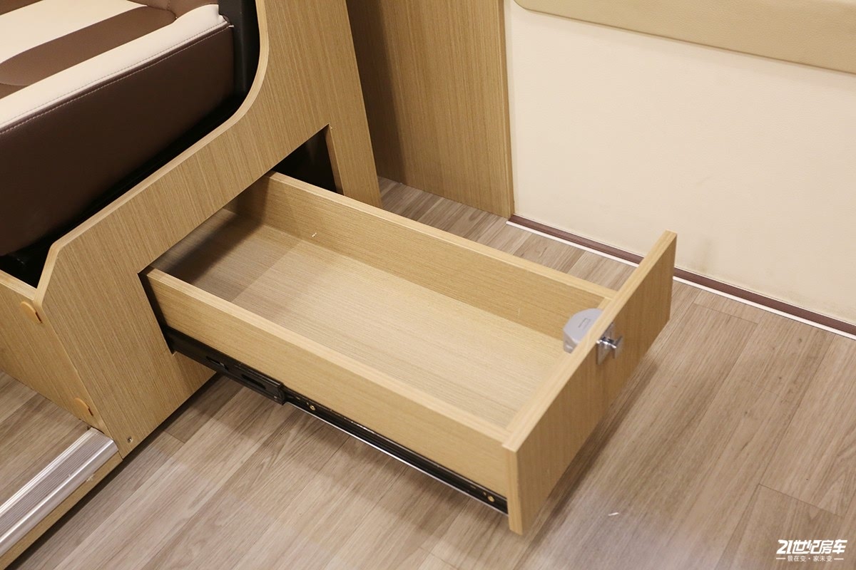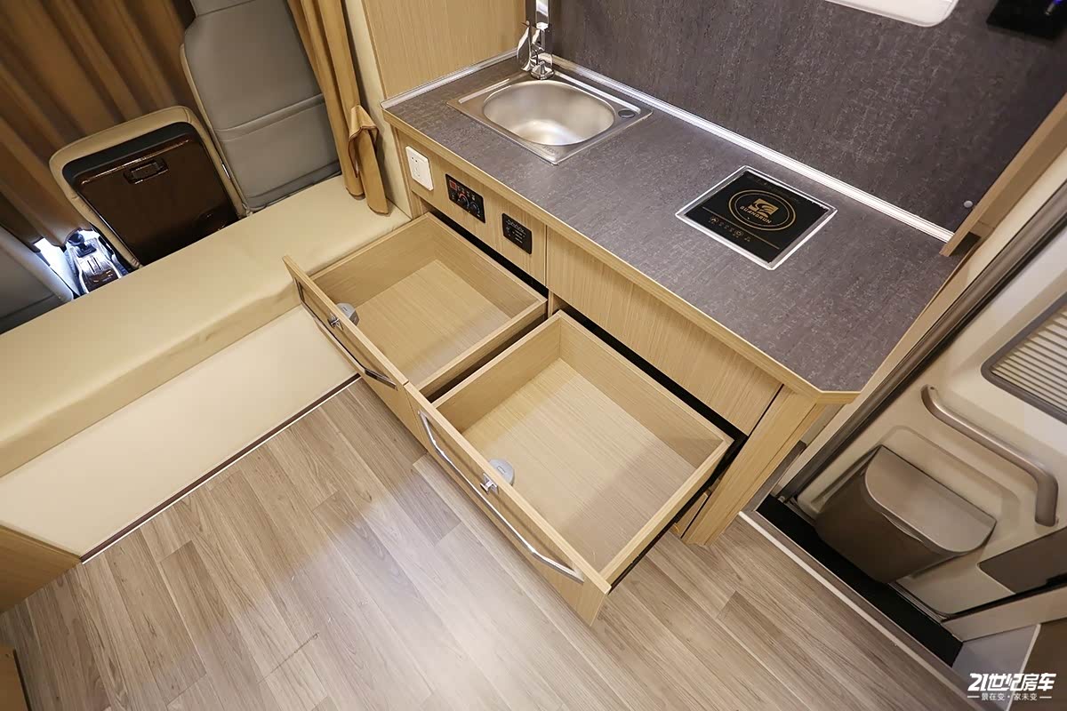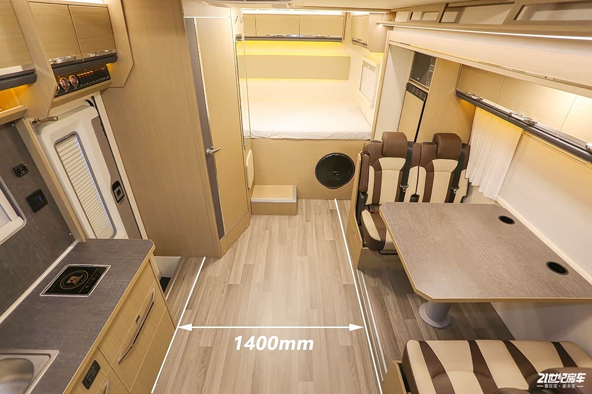 这款车拓展舱最大拓展出67公分,内部显然更能够体现出拓展舱带来的可观的大空间感受。从厨房到拓展舱边缘,客厅横向最大间距1400mm,这是其他拓展车型,甚至是双拓展都难以企及的。