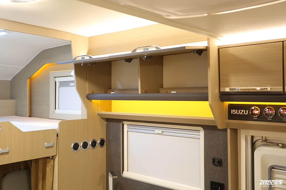 整个生活区部分,包含布局、配色、配置层面,庆铃五十铃M600大羚羊和五十铃700P可可西里几乎是保持一致的设计,前额头双人床+中前置厨房+4人对座会客区+后横置双人床+卫生间,这是拓展车型最常用的布局。上面图已经为大家展示了整个生活区的空间表现,作为本身空间就比较大的平头轻卡房车,拓展舱的再融入是将优势再放大的设计,甚至它比双拓展车型更占优势。