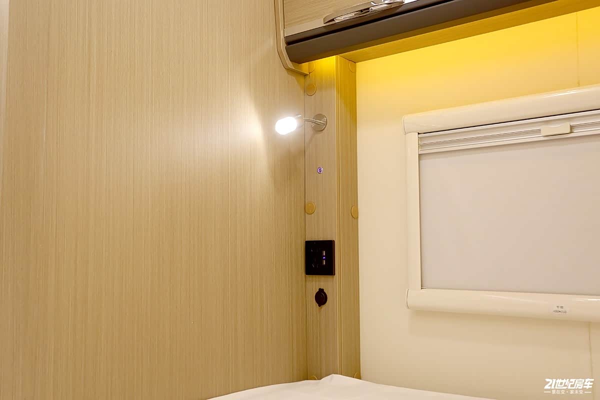 额头床内部区域设计规整,额头床两侧用木质材料做了一个造型框架,内部使用暖色氛围灯填充。额头床两侧带有侧窗和顶部天窗,采光和通风换气不错。床板上翻之后是一款40英寸液晶电视机,满足日常的娱乐消遣。