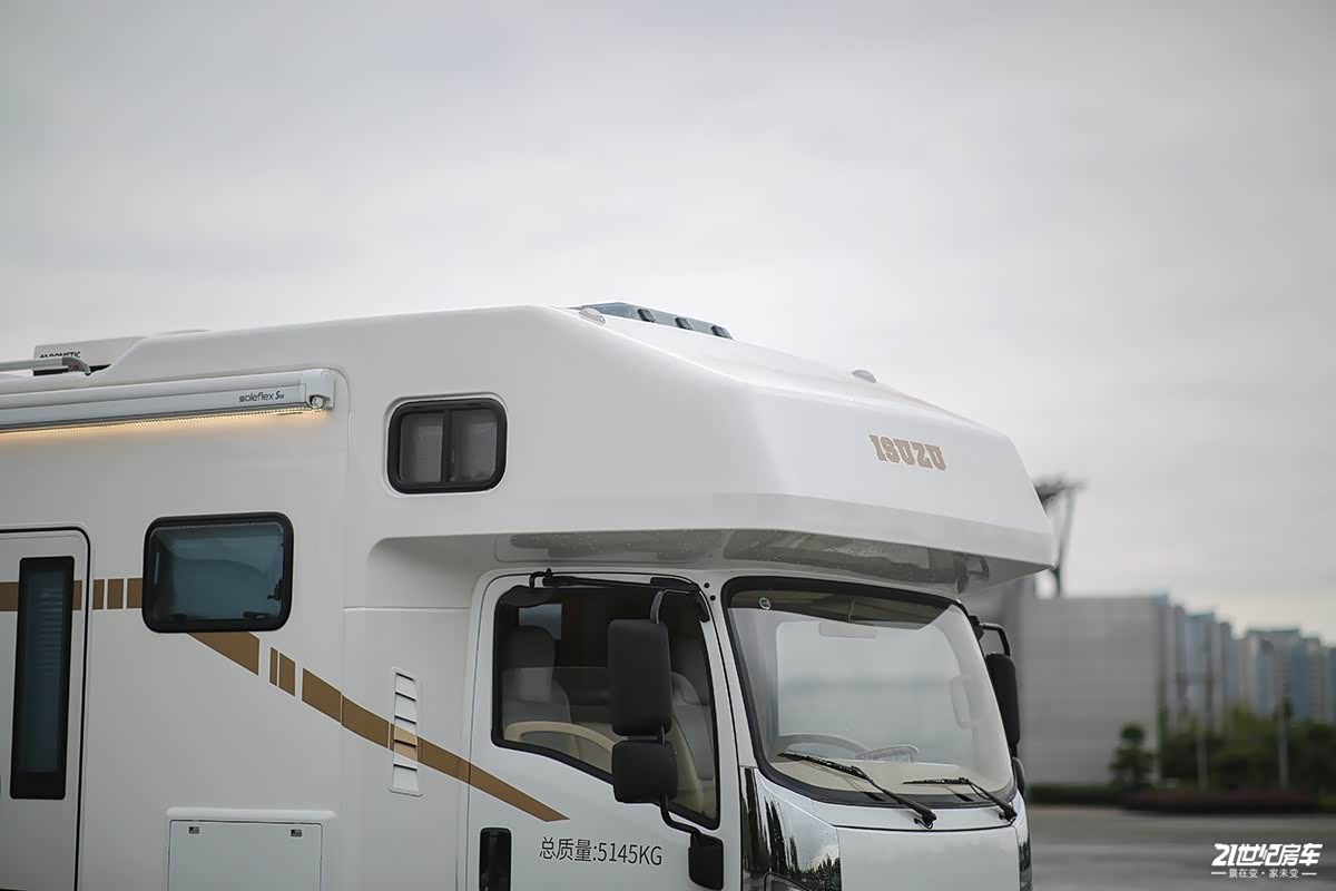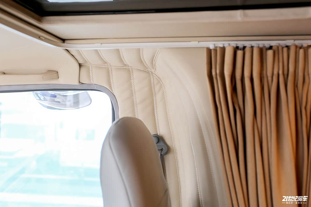 车辆B柱位置,驾驶室和厢体部分连接处都采用了皮质包覆,从驾驶室过渡到生活区比较自然 。