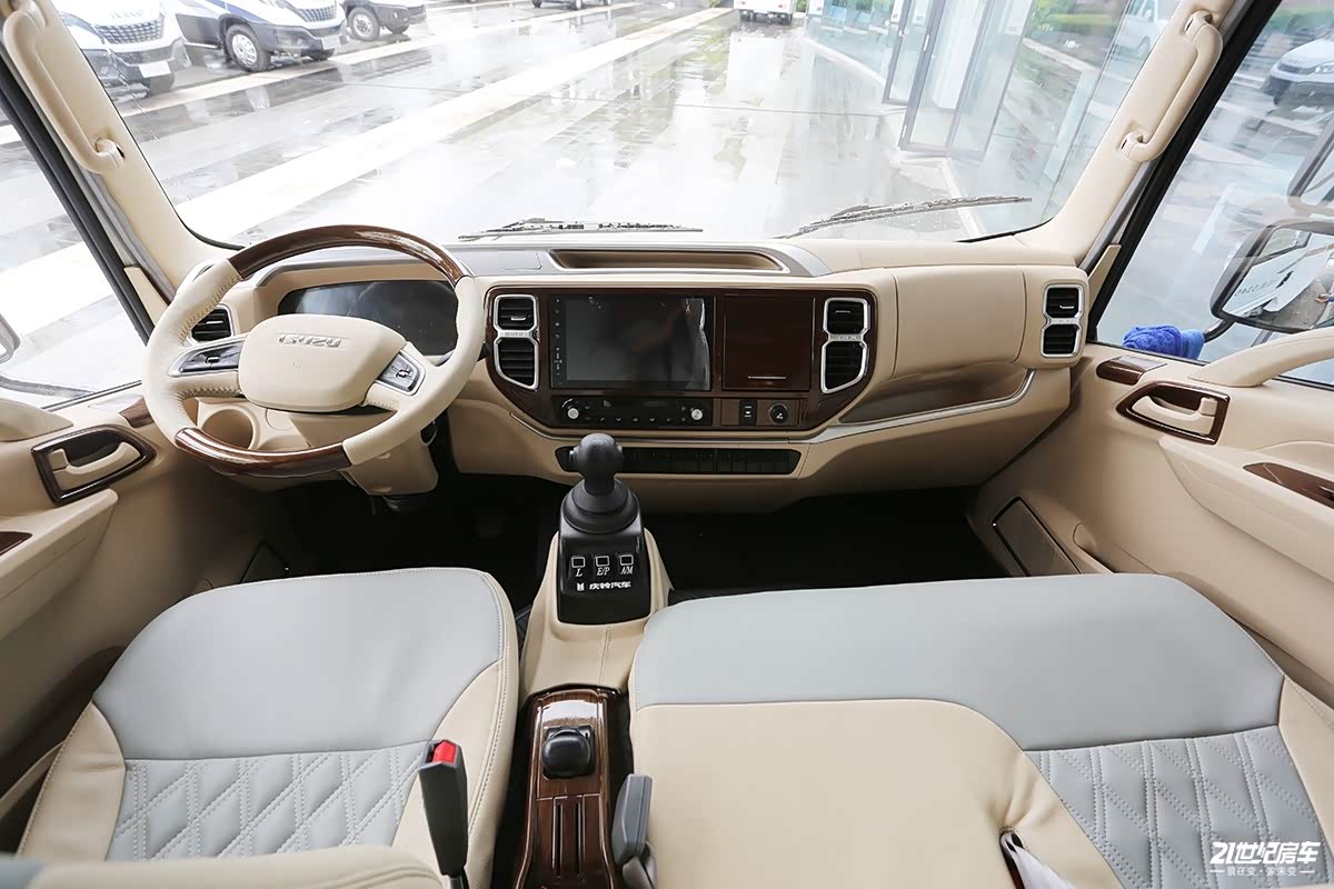 驾驶室方面,为了与生活区风格一致,驾驶室内包含中控台、两侧门板、A柱以及座椅等全部换成了米白色的装饰,两辐式多功能方向盘,顶部和底部采用了仿桃木的水转印材质包覆,中控台则大面积采用水转印工艺包覆,整体感觉M600大羚羊的驾驶室要比700P更显精致一些。10寸中控大屏包含了多媒体、蓝牙电话、手机互联、倒车影像、语音导航、安装APP等功能。另外,在基本配置上这款车标配有电动门窗、中控锁、定速巡航以及遥控钥匙等。作为行车充电重要的一部分,这款车有24V 50A发电机升级为24V 80A发电机,以此适应房车生活区大电池馈电下的充电效率。