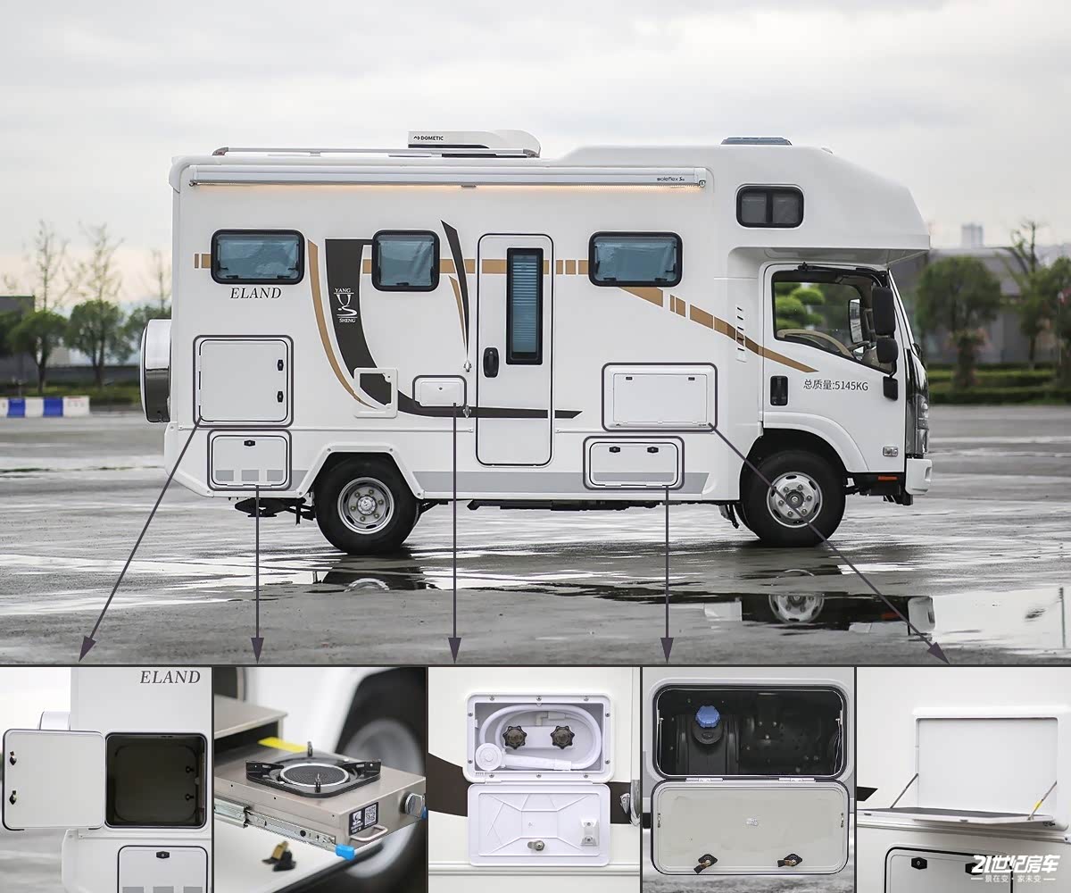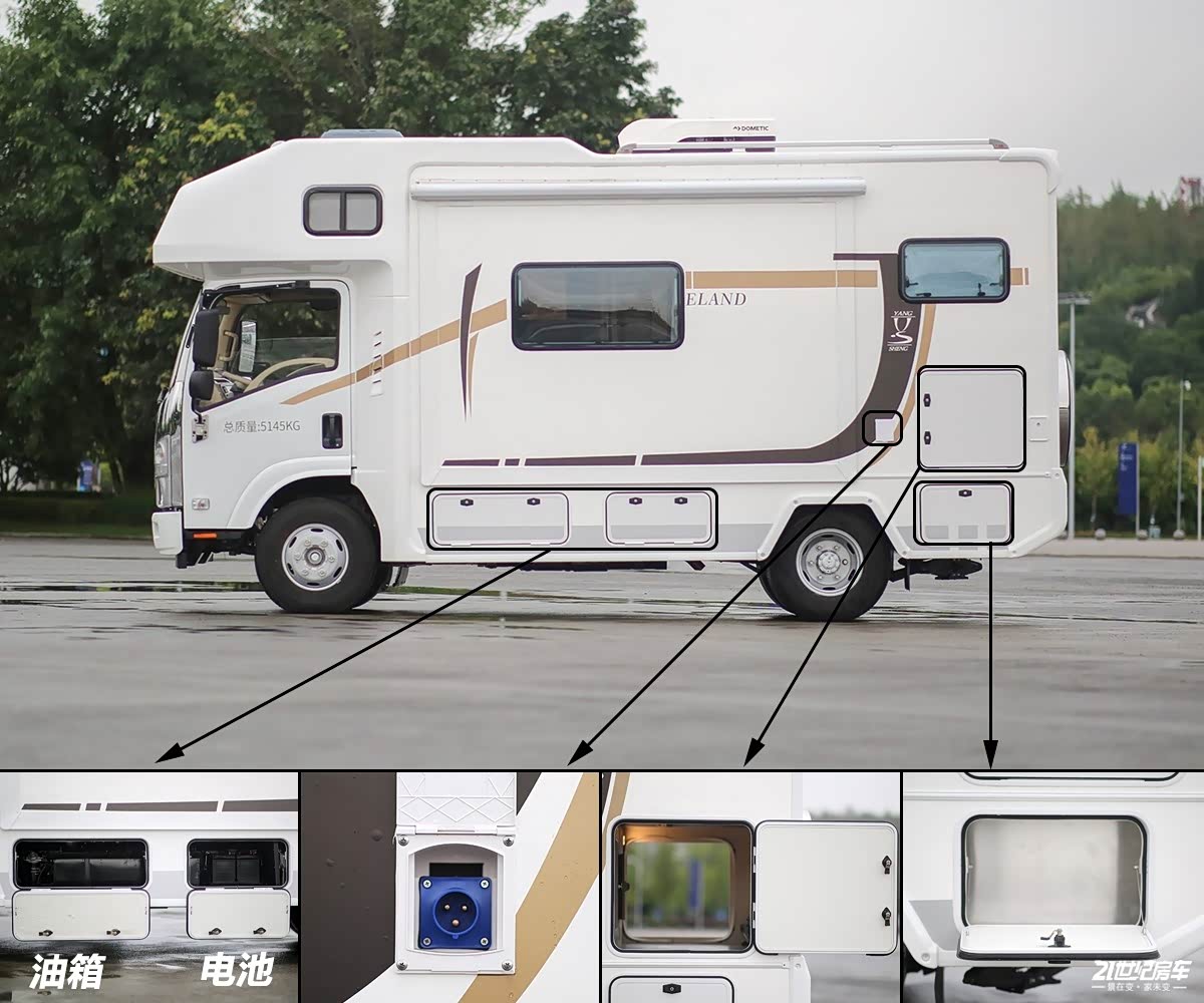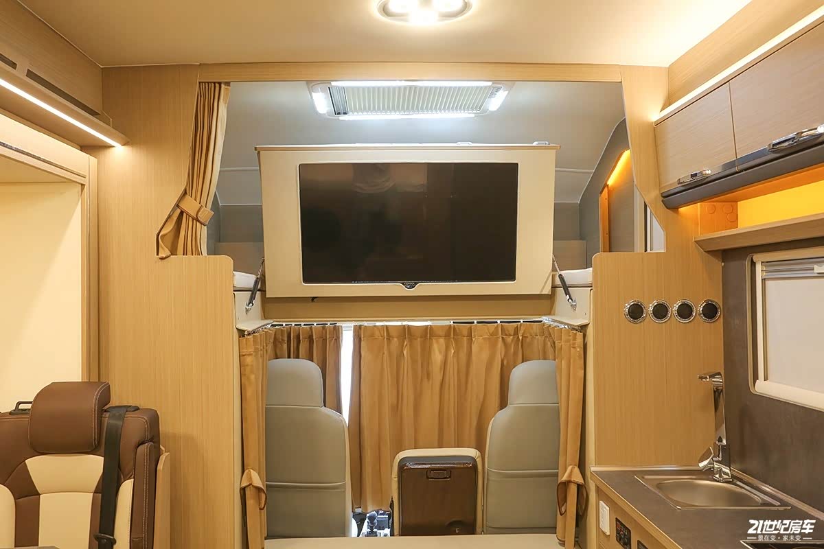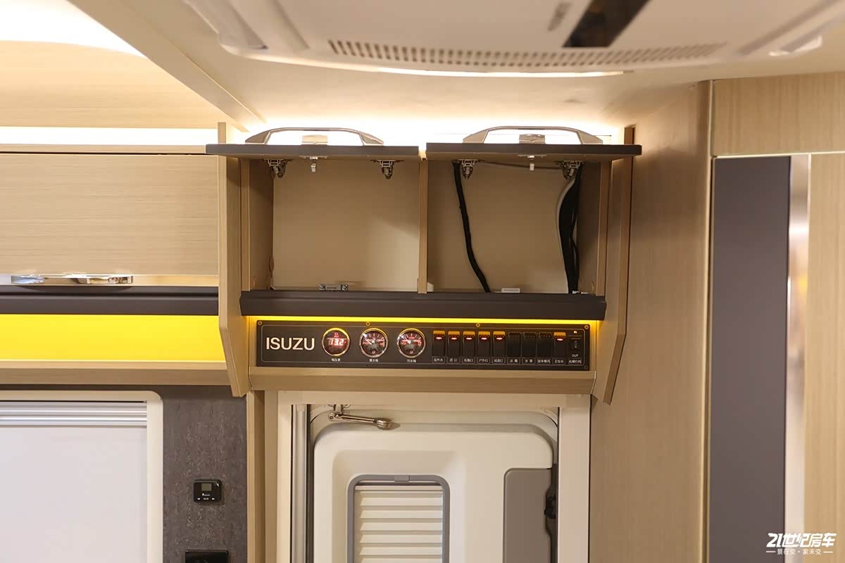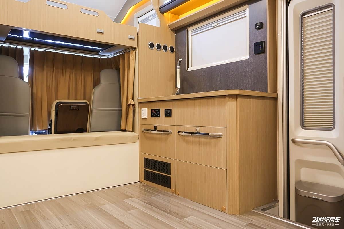 厨房顶部吊柜和中门顶部吊柜紧挨着,所以在储物的时候便于拿取。这款车采用的是常规的实体按键总控制区,这样也便于老年用户操作,看起来直观简洁。电力部分,这款车标配的是200Ah铅酸电池,3000W充逆变一体机。对电能需求比较大的用户可升级至1000Ah锂电池和1000W太阳能电池板。