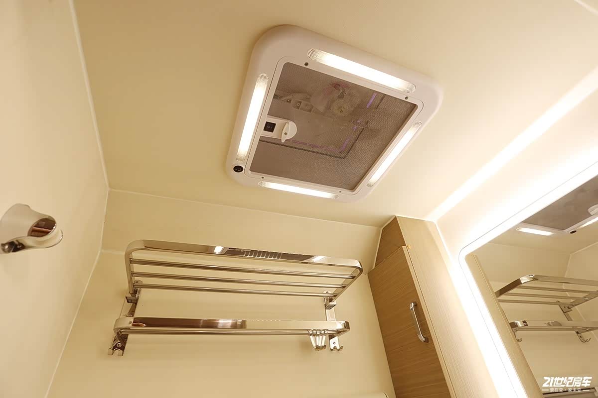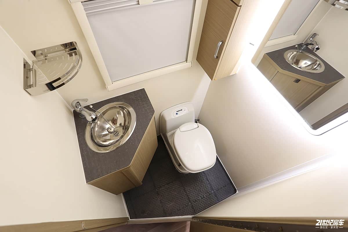 可以看到卫生间内部有点类似酒店的轻奢风格,浴巾架、带照明灯带的化妆镜、置物台以及一体式花洒。卫生间内洗脸盆为不锈钢材质,角柜的内储物空间还不错。当我们在里面淋浴的时候可将水龙头拆下作为花洒使用,赛特福德坐便器同样可以旋转达到内部空间的充分利用。新车水路系统标配300升净水箱,80升灰水箱和20升黑水箱。