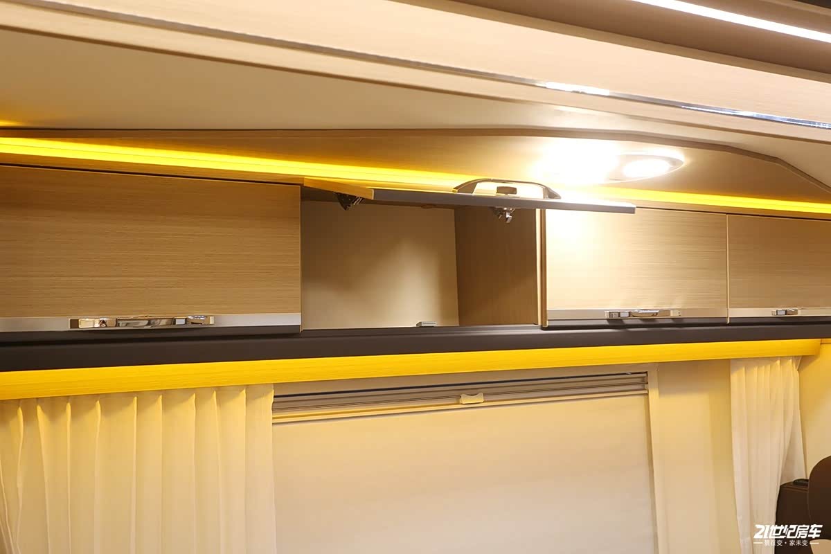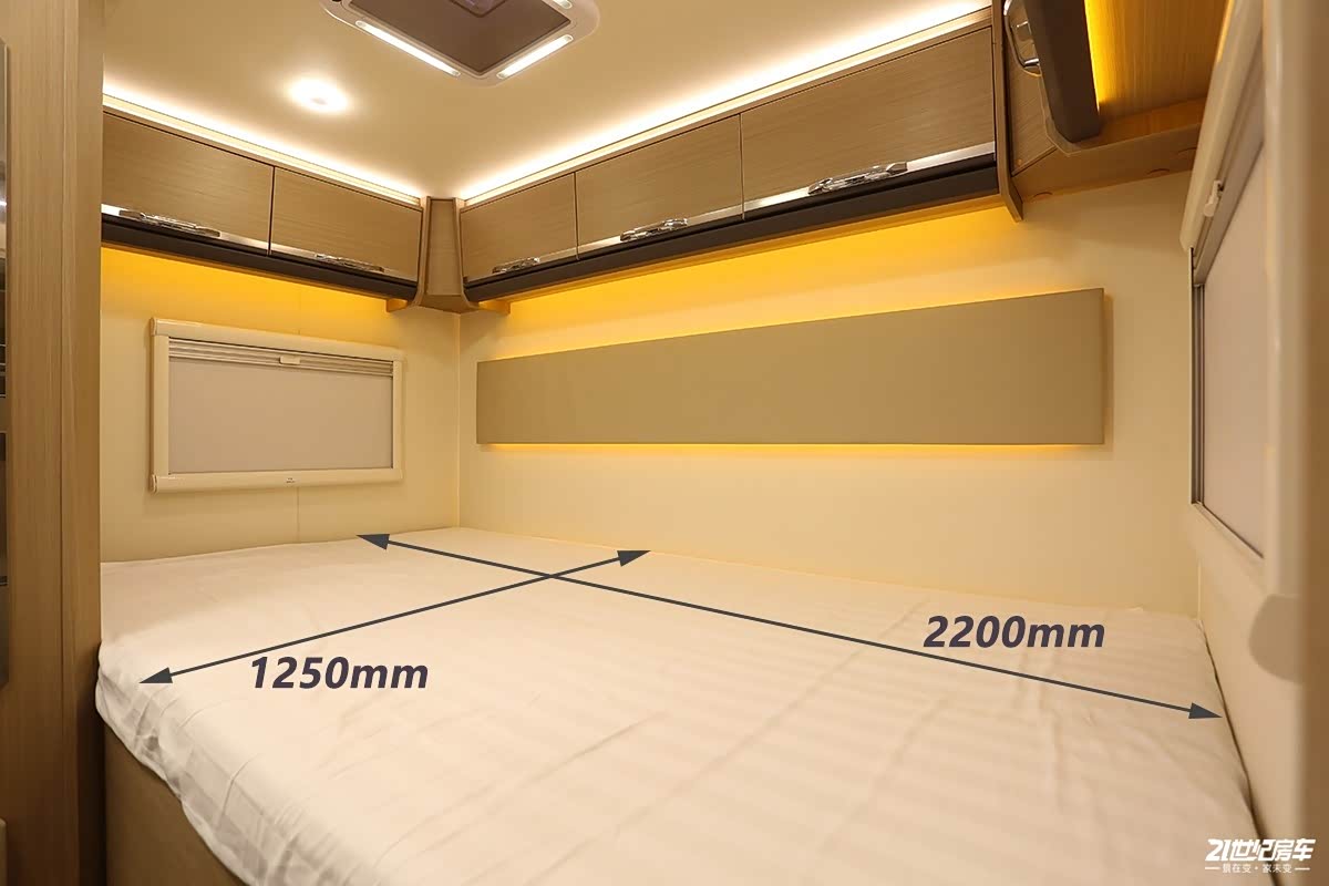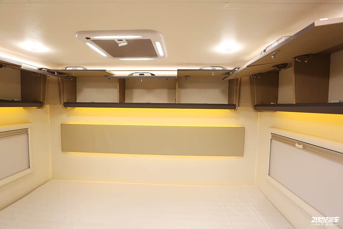 后横床区域作为车内抬腿就能上到上面的主休息区,整体舒适性不错,床位高度适中,如果有老人和儿童可踩踏床底的木凳来到床上,床位顶部空间充足,两侧有通风窗,顶部也加装了换气扇。对于随身行李物品收纳方面,整个顶部一圈吊柜组合,足以满足后床2人的储物需求。