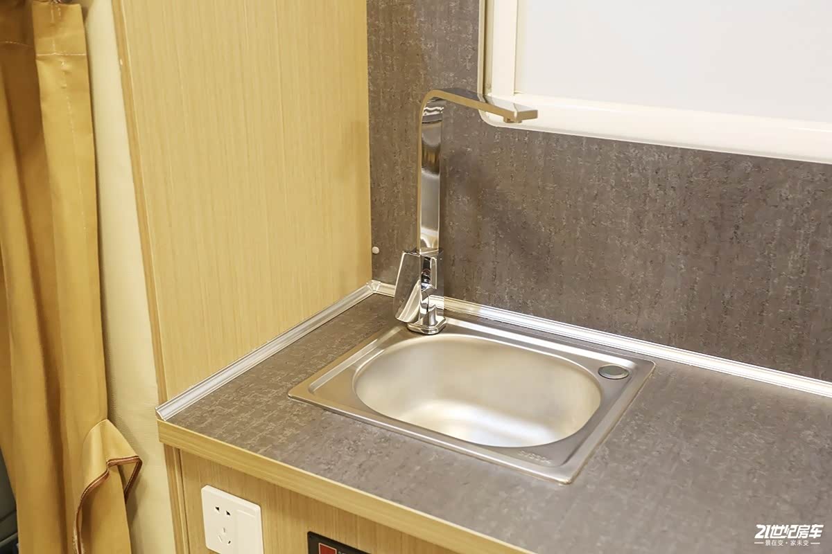 厨房区尺寸大小适中,整个台面上包含了一款镀铬不锈钢高脚水龙头配备椭圆形洗菜池,右侧是一款电磁炉,做饭油烟依靠开设的窗口自然排出。五十铃M600大羚羊房车生活区也配备有行车空调,这得益于这款底盘搭载的是双压缩机、双套蒸发箱及双套冷凝器,为独立的两套空调系统,另一套提供给驾驶舱。