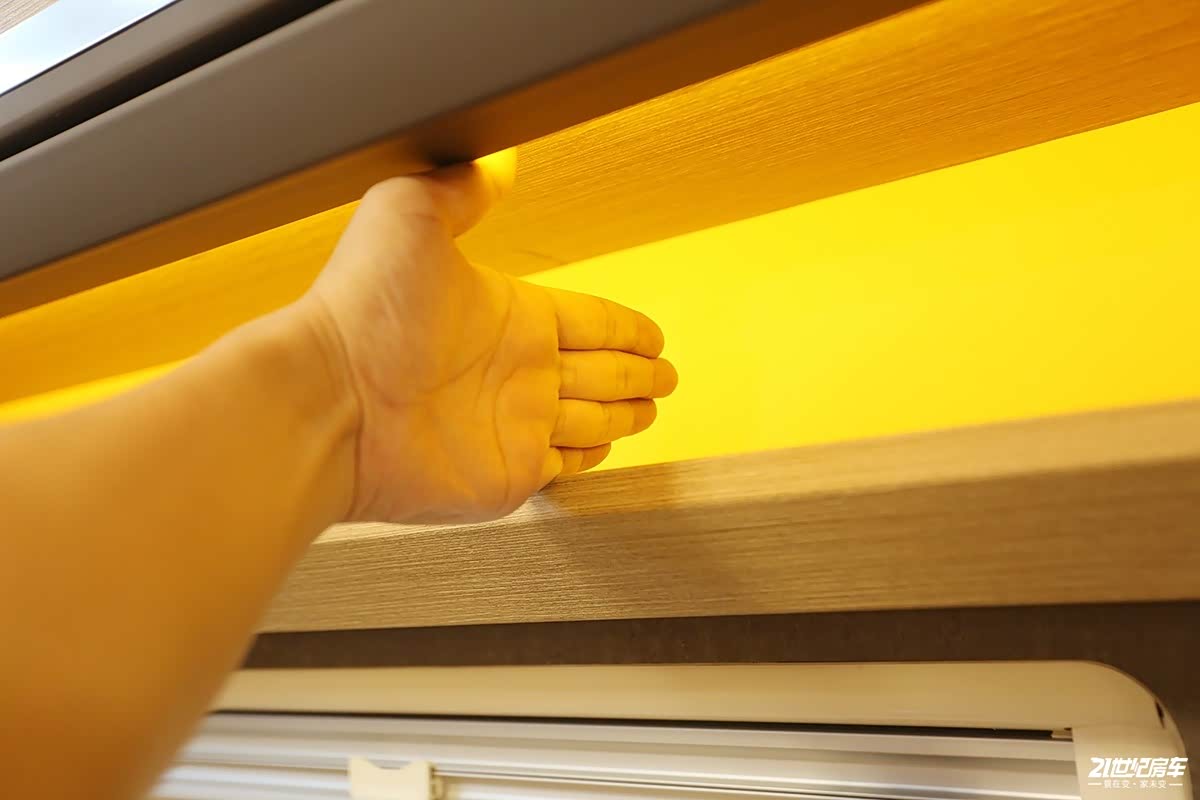 厨房顶部的储物空间分为上下两部分,上方是带有吊柜门的储物格,下方是开口储物格,这种设计更为灵活,像车内电子设备的遥控器等零碎物件可随手放到这里,通过实际的比量,高度约一掌多的高度,整体储物能力还不错。