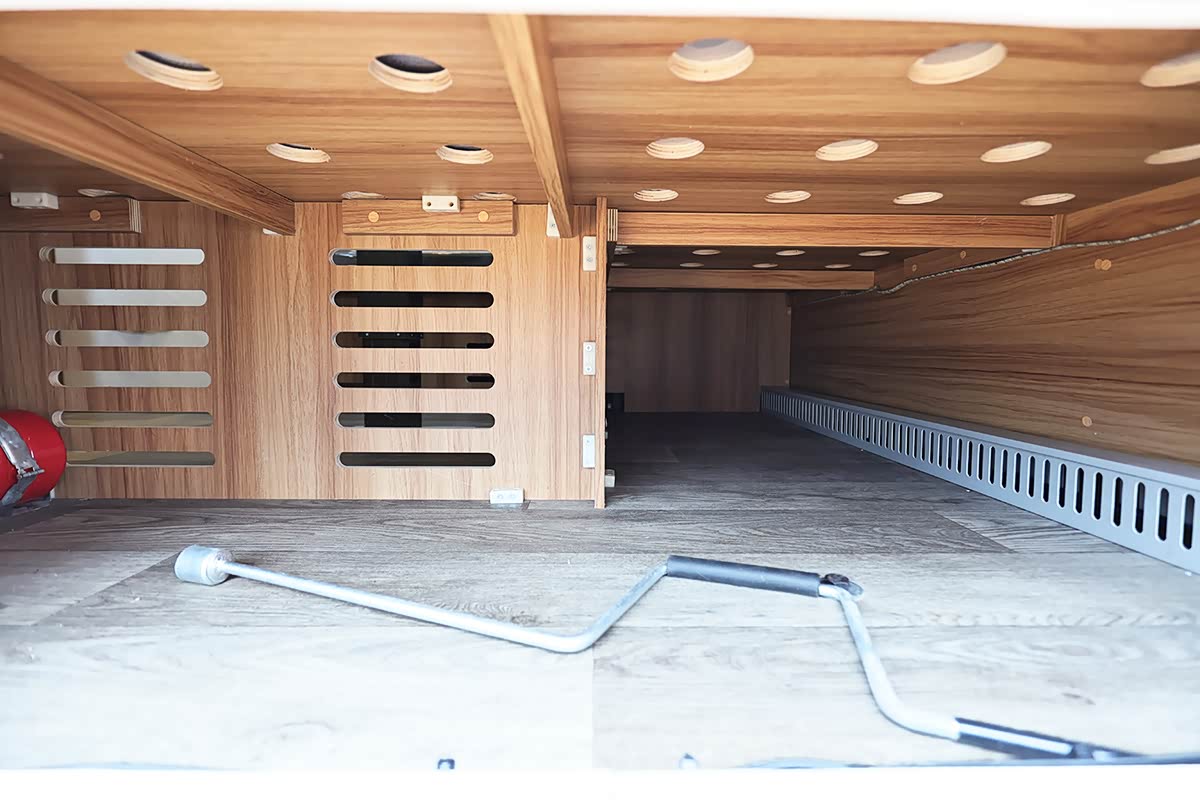 电路方面标配的是100Ah铅酸蓄电池,也支持选装更大容量的锂电池系统。供暖方面这款房车配备的是独立的柴油暖风系统。