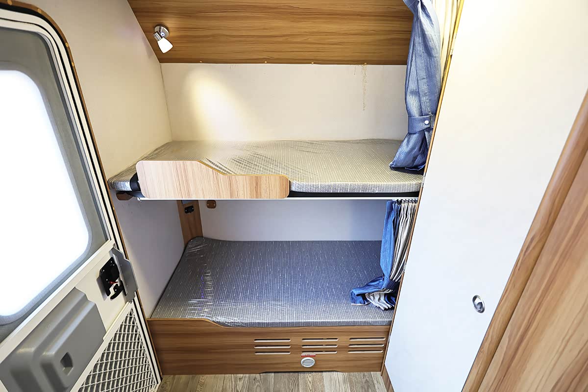 最后就是车尾的卧室区域了,这里是2张2.2×0.75(米)的床位,充足的床位长度即使是成年人也能使用。两张床位外侧都设计了隐私拉帘,配备了阅读灯和充电口。这么一款10.98万能住4人的小型房车,您觉得性价比如何呢?