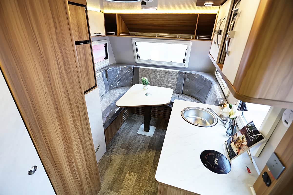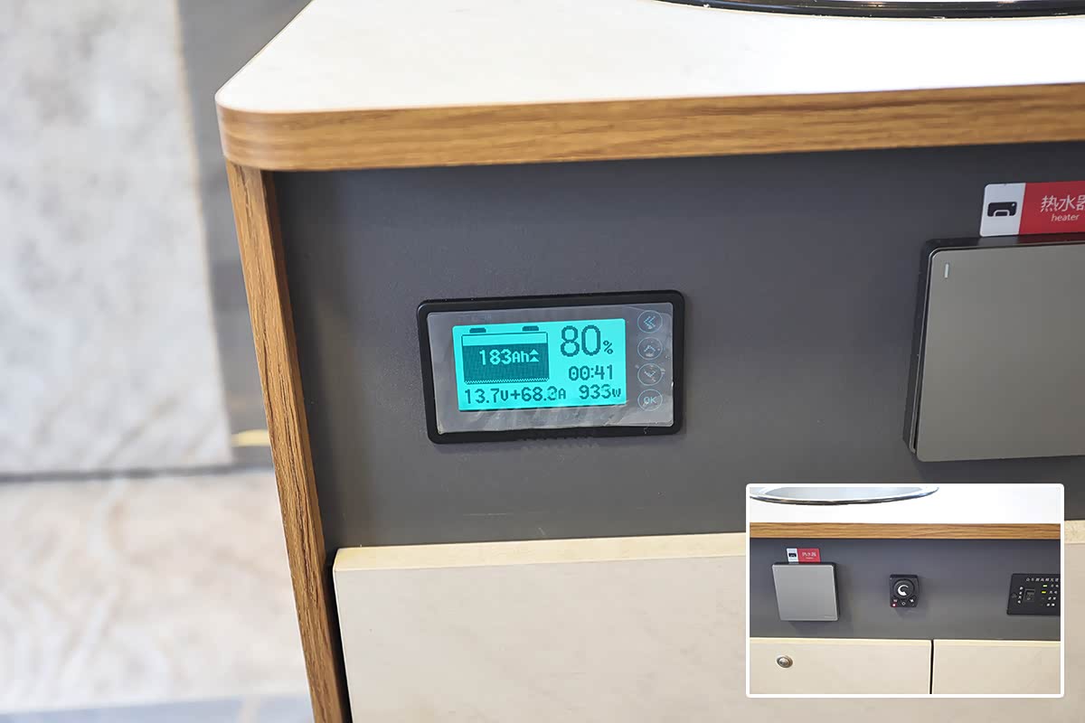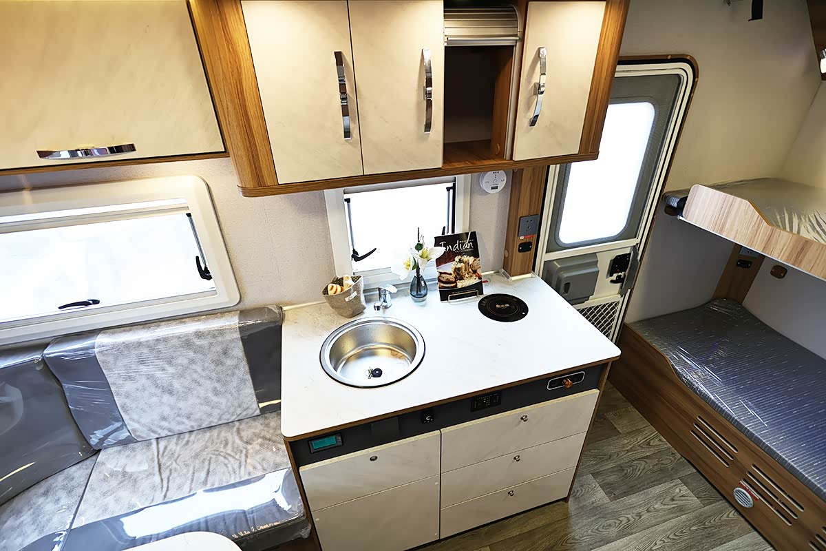 这款房车的车外配备了外置抽拉式柴油灶台,车内厨房作为补充标配了900W电磁炉和不锈钢洗菜池。