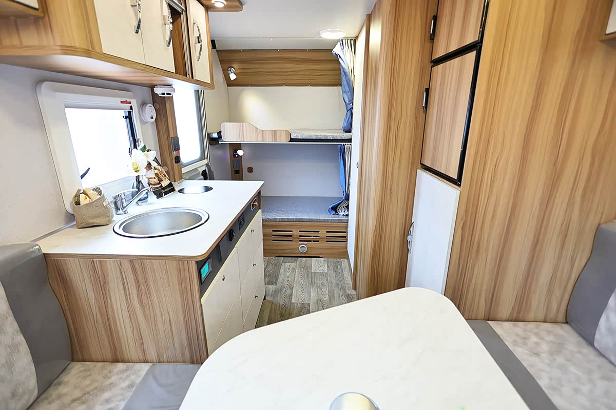 这款T553房车的整车尺寸为长5.5×宽2.3×高2.60(米),整备质量1.36吨,适合牵引的前车排量在1.6升以上。底盘部分新车基于厂家自主研发的700Mpa高强钢车架打造,并匹配了德国爱科的1.5T扭力轴、减震器、惯性同步制动系统及导向轮,可选装爱科AKS 3004摇摆稳定器。