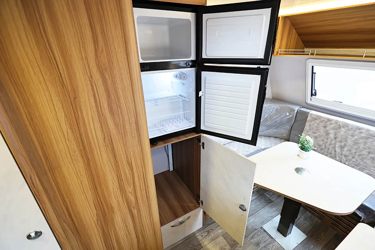 厨房对面设计了衣柜,85升的双开门房车冰箱也布置在这里。