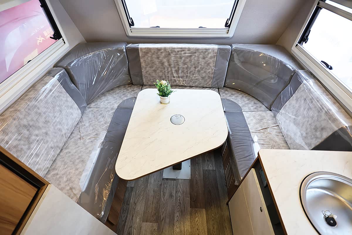 客厅区域常规状态下是环形卡座沙发,空间上同时坐6个人没有问题,客厅三面墙壁都配备了双层亚克力保温车窗,可以打开换气,带有防蚊帘和遮阳帘。沙发中央的餐桌可以调整高度,降到最低并把沙发靠背铺上去,就变成了一张2.2×1.4(米)的双人床了,这个区域的空间利用的比较到位。