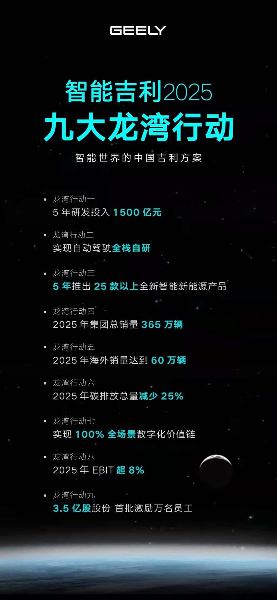 5年研发投入1500亿元;5年推出25款以上全新智能新能源产品;2025年集团总销量要达到365万辆;2025年海外销量要达到60万辆;2025年碳排放总量减少25%;实现100%全场景数字化价值链……