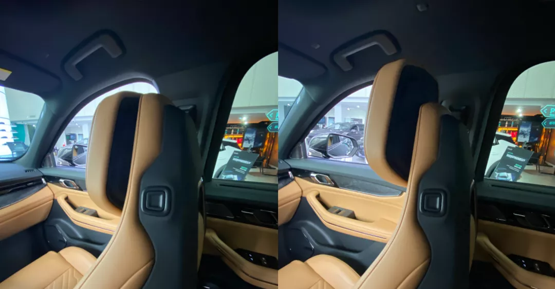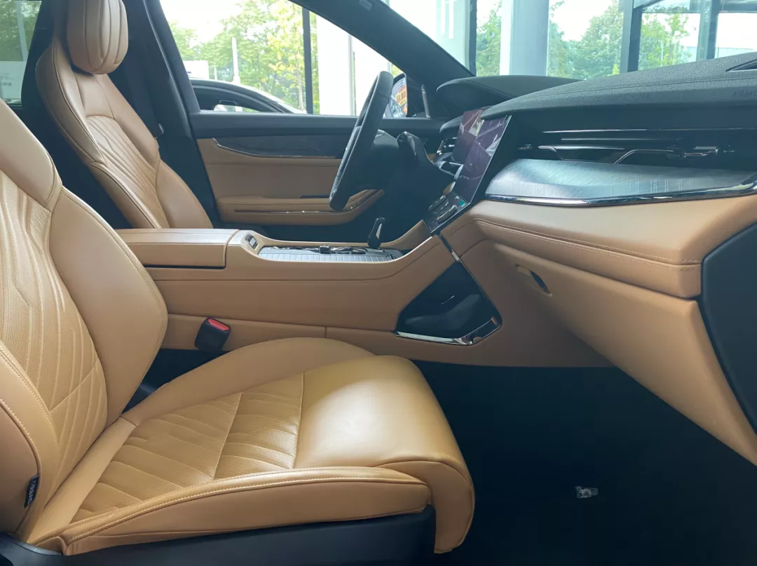 在仪表板上,领克09用12英寸的中控横屏+6英寸的空调液晶调节面板取代沃尔沃的竖屏,同时也取消掉沃尔沃略显老气的框形出风口,更换成四个面积更小、横向叶片更简单的小型出风口。虽然没有运用当前更流行的贯穿式出风口,但是巧妙地利用装饰条颜色和尺寸比例的搭配,将右侧的中央出风口和乘员侧出风口连接在一起,拉升了横向比例,让整个仪表板看起来不像XC90那样宽大。