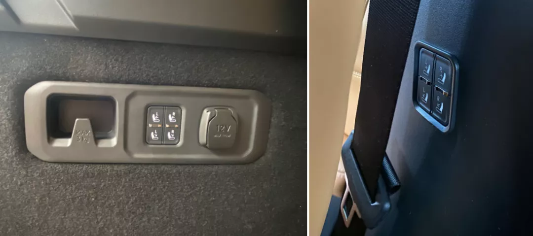 全车有两个地方可以对第三排座椅进行调节,一个是在后备箱内,另外一个在右边B柱内侧,电动按钮既能放倒座椅也能调节椅背角度。