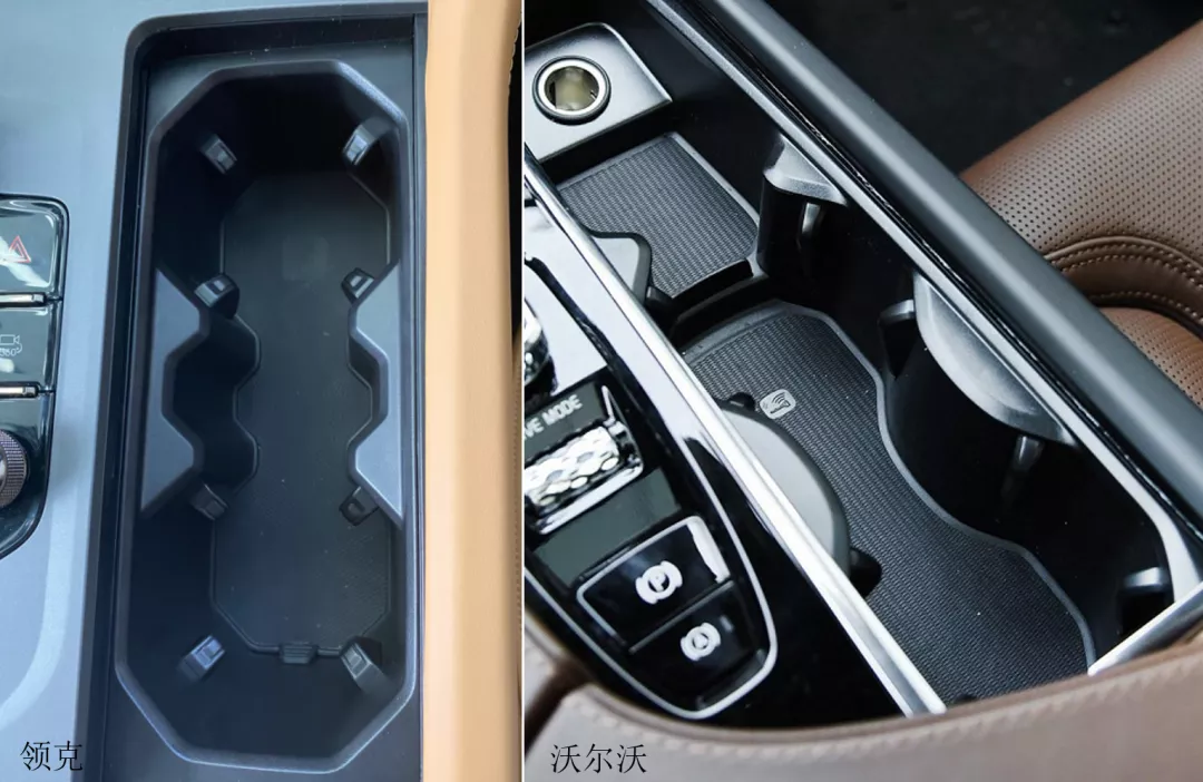 领克09的副仪表板布局借鉴了沃尔沃的部分元素,左侧都是调节按钮,右边都是使用了带卷帘门的杯托,杯托内部的结构也有一定程度的相似,只是沃尔沃的卷帘门表面有木纹、铝板等多种配置,每一格的尺寸也更窄,目视上更细腻精致。