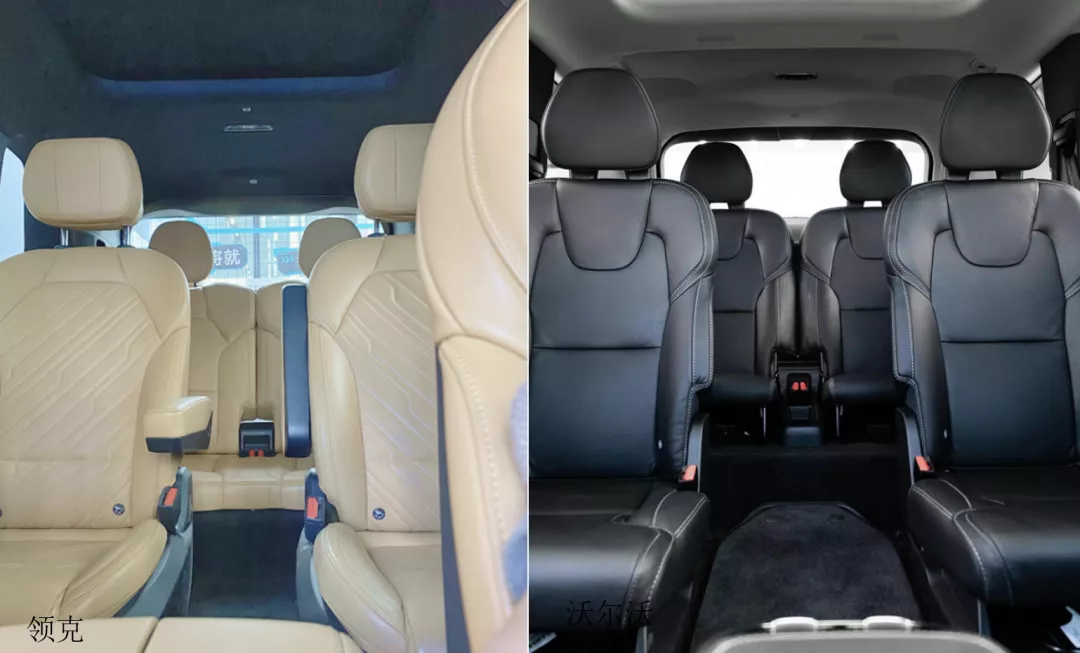 领克09三排座椅的头枕没有像XC90做成与二排的样式一样,可能是考虑到不影响中央后视镜的视线,左右宽度设计得略小。从这个视角看过去,也明显看到XC90的座椅通道布置得比领克09宽,而且三排座椅头顶的偷空间设计也比领克09更明显。