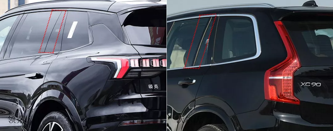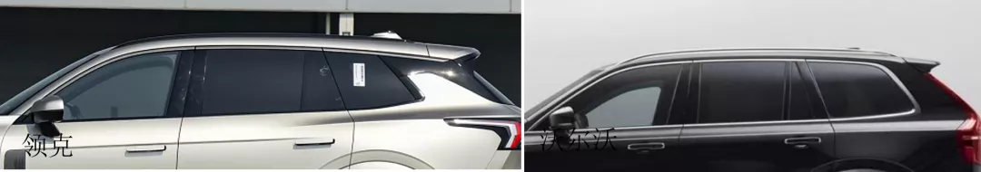 由于轴距是没有办法改变的,领克09整体加长的49mm就体现在了车辆的尾部。为了填补前轴与A柱之间这块长距离的比例,领克09像路虎一样加了一块“补丁”,并且这块“补丁”同样还是使用了前面提到的哑光铁灰表面处理效果,相比起路虎不会把所有焦点都吸引在这块板上。其实XC90没有加这块饰板看起来效果也不差。