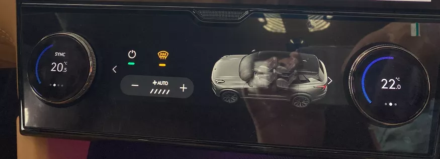 空调调节面板使用了全液晶显示屏,实体旋钮在调节温度时也能显示具体的信息,中间的触摸屏也能针对具体的区域和功能进行专项调整: