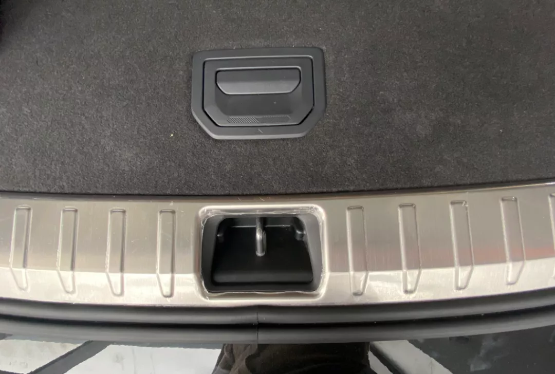 产品设计师非常用心的在地板开启按钮的旁边画了一个箭头示意按压的位置,其实很多车在第一次使用时真的不知道按什么位置。不过无论是XC90还是领克09都不喜欢把连接尾门的挂钩隐藏起来。