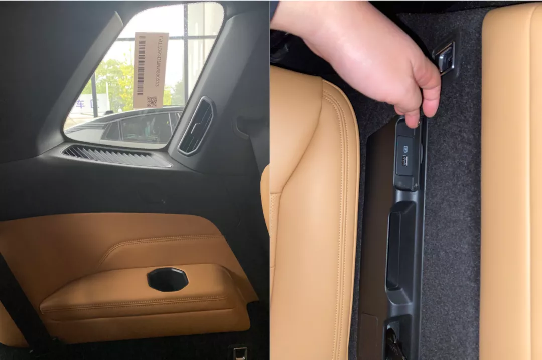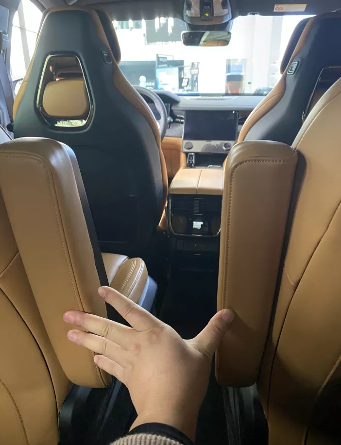 我们看到的这台车是六个座位的布局,第二排座椅造型上与前排保持一致,头枕厚度也有增加,能通过电动按钮实现调节,但不能左右滑动。因为是独立座椅,就没有了中间位置的杯托。考虑到储物的容量,所以前排座椅背后并没有使用常用的皮口袋来储物,而是改成了伸缩弹性更大的橡筋网兜。