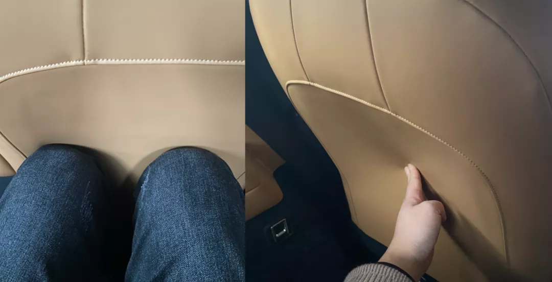 把二排座椅调到能坐的位置,第三排的膝盖是没有多余空间的,但产品工程师在这里做了一个有心机的设计——将二排座椅背后掏空,让你的膝盖不会真正的顶到前排座椅的背部硬物。其实吧,三排座椅后面还是留有很大余地的,但是按照沃尔沃的安全标准,他们又不太愿意为了空间去牺牲安全系数。