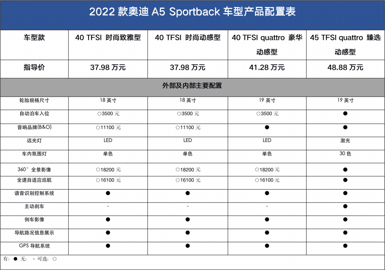 为了能更为直观地展现出奥迪A5 Sportback 不同版本车型的配置差异,我们将新车的亮点及实用性高的配置进行列举对比并推荐。在四款车型的配置对比中可以看到,GPS导航系统、导航路况信息显示、倒车影像、语音识别控制系统等实用便利功能均有标配;而自动泊车入位、360全景影像、全速自适应巡航等功能仅有顶配车型标配,其余车型可选装;灯光方面,顶配车型采用激光远光灯,而其余三款车型使用LED远光灯;车内氛围灯只有顶配为30色,其余三款车型为单色;