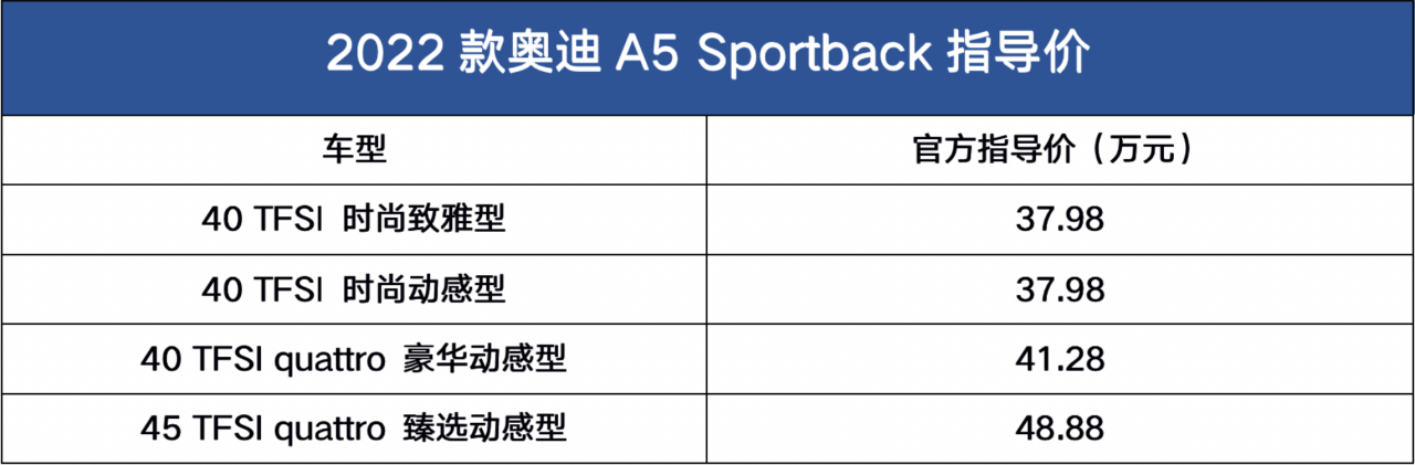 奥迪A5推出共计4款车型,40 TFSI 时尚致雅型(指导价37.98万元)、40 TFSI 时尚动感型(指导价37.98万元)、40 TFSI quattro 豪华动感型(指导价41.28万元)、45 TFSI quattro 豪华动感型(指导价48.88万元)。
