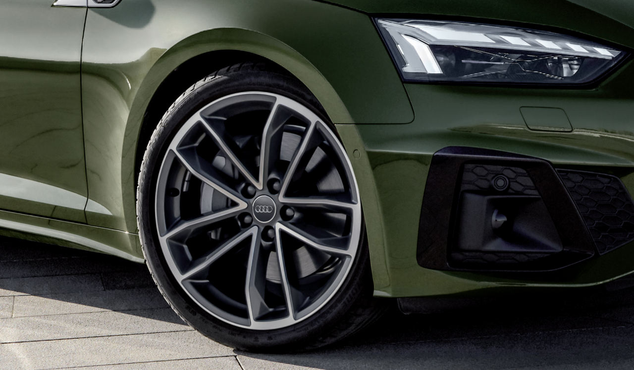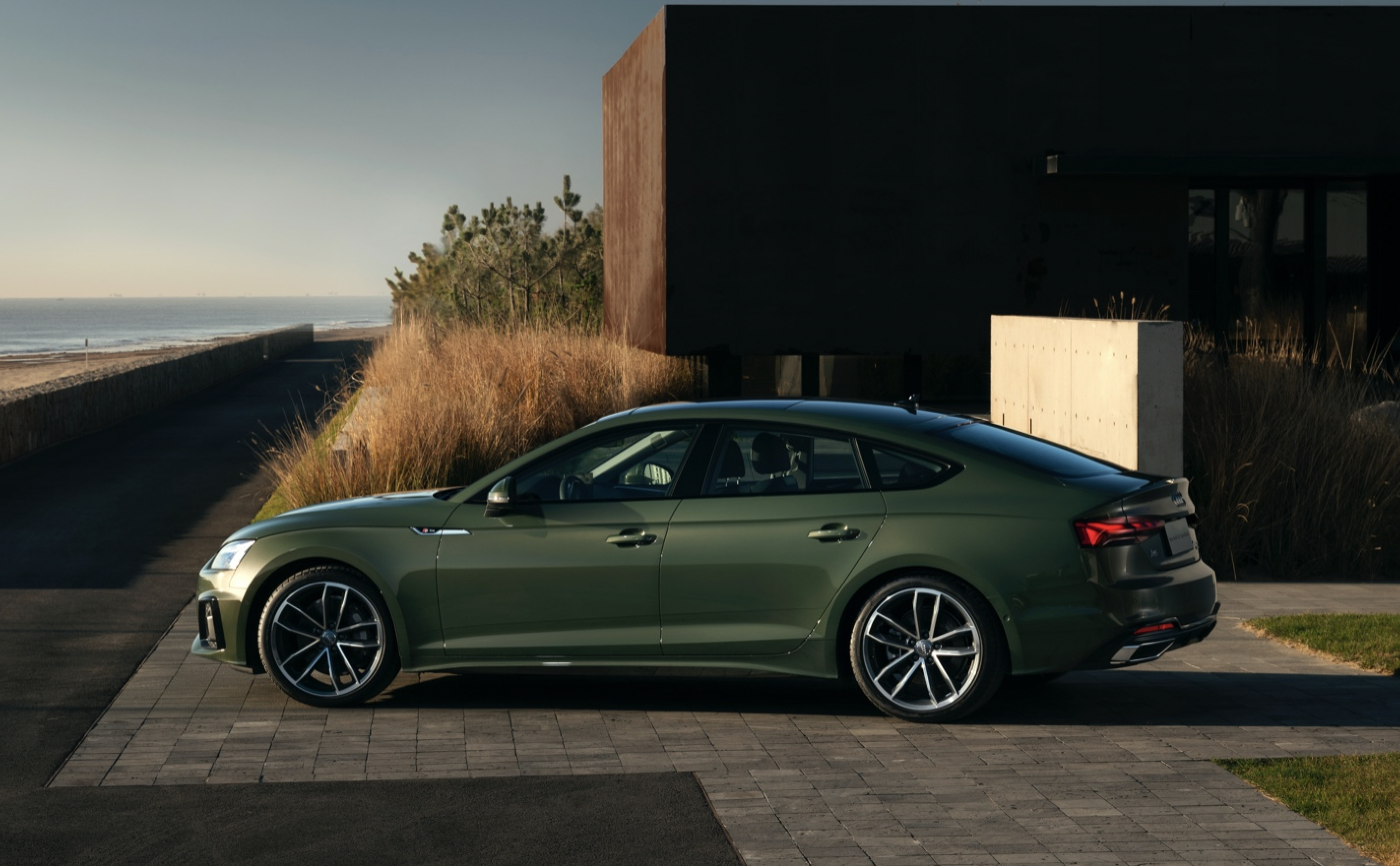 车身侧面,造型修长低趴,车身呈流线状,全新A5采用无框车门设计,B柱前侧刻画得潮流而硬朗,C柱后则是标志性优雅律动的线条。新车采用双五辐式镀铬轮毂,外圈高光内圈阴影,颇具层次感。并根据车型配备不同尺度,40 TFSI 时尚致雅型和40 TFSI 时尚动感型为18英寸轮毂,40 TFSI quattro 豪华动感型和45 TFSI quattro 豪华动感型则为19英寸轮毂。