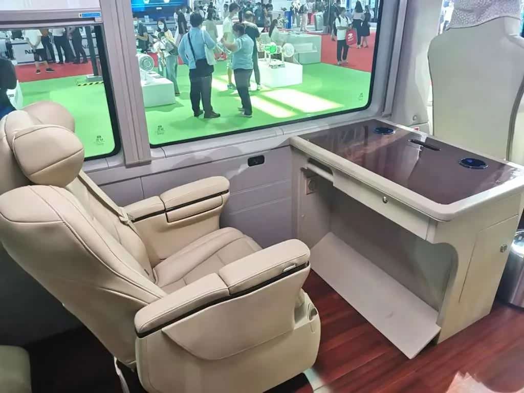 光从外观来看,多数读者肯定想不到这辆车的乘坐人数仅为10人。我们平时见到的中巴车内部大都是单双座排列座椅,为了多坐人车内空间非常紧凑。而来到这辆比亚迪C6车上就会发现中巴车竟然可以如此豪华,车厢内高足有1925mm,乘客在车内站立行走毫无压力。过道十分宽敞,棕灰色的车内地板透出别样的品味,两边是宽大的皮沙发,坐在车上就好像坐在宽敞的会客厅里一样惬意。由于有些客人会有在车上办公休息的需要,车上还设置了多功能的方形办公桌,做工十分精致。这辆比亚迪C6车上的配置堪称豪华,其实比亚迪提供的可选装配置还有很多,客户可以根据自己的需要进行增减,不管是看得见的设备或者看不见的系统,只要客户有需求,比亚迪均可满足。