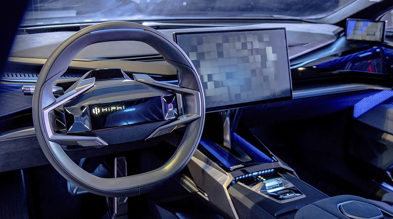 矗立在中控部分的大尺寸屏幕同样吸引眼球,看似悬浮但其实背后布置有可多轴位移的车载数字机器人HiPhi Bot。其实,这就是一款可以多方向进行移动的机械手臂,通过与车载多媒体系统和声音采集系统的融合,能够分辨出交互者的方位,并将屏幕转向交互者方向,还可以跟随音乐一起摆动等。