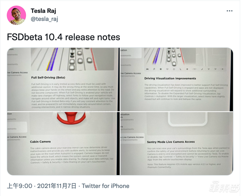 11月7日,特斯拉发布了FSD Beta的最新测试软件10.4版本。在这一版软件中,更新了一系列新功能,其中包括识别高速移动对象、改进紧急制动车辆检测、提升狭窄空间通过速度等。在这次更新中,系统还配有自动录像,收集用户的FSD使用反馈。