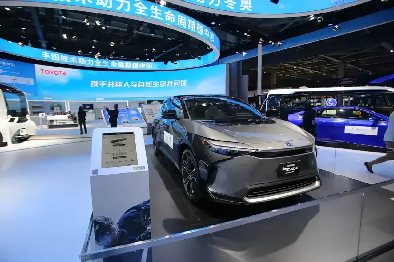 另一边的丰田展台与去年坚持氢燃料电池方向不同,今天多了纯电动车的戏份。丰田带来了上海车展上那辆bZ4X CONCEPT概念车,而量产版将为北京冬奥会提供保障。