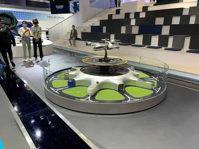 除了Trailer Drone概念车以外,现代城市空中出行(UAM)模型同步亮相,展示了一个未来出行愿景。该空中出行模型以PAV飞行汽车、PBV专用车和HUB立体枢纽三个模块为核心。