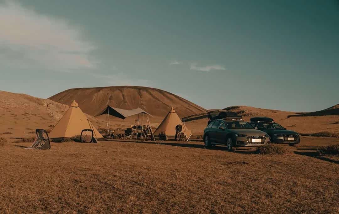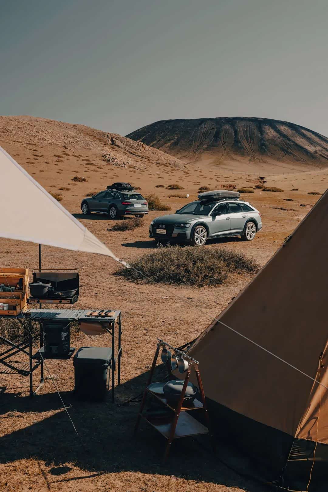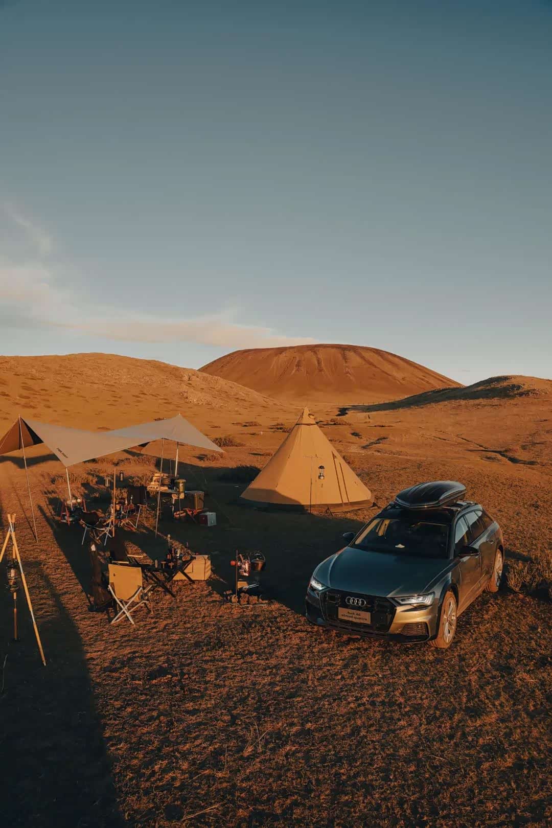 为了追求更野的露营体验,我们把营地设在了火山附近。崎岖的非铺装路面对车辆的越野能力是不小的考验。无论是A6 allroad,还是A4 allroad,都具备“越野驾驶模式”。特别是A6 allroad,强大的空气悬挂系统可以升高车辆底盘,增加车辆的通过能力。A4 allroad的底盘调校也完全可以应对全路况。