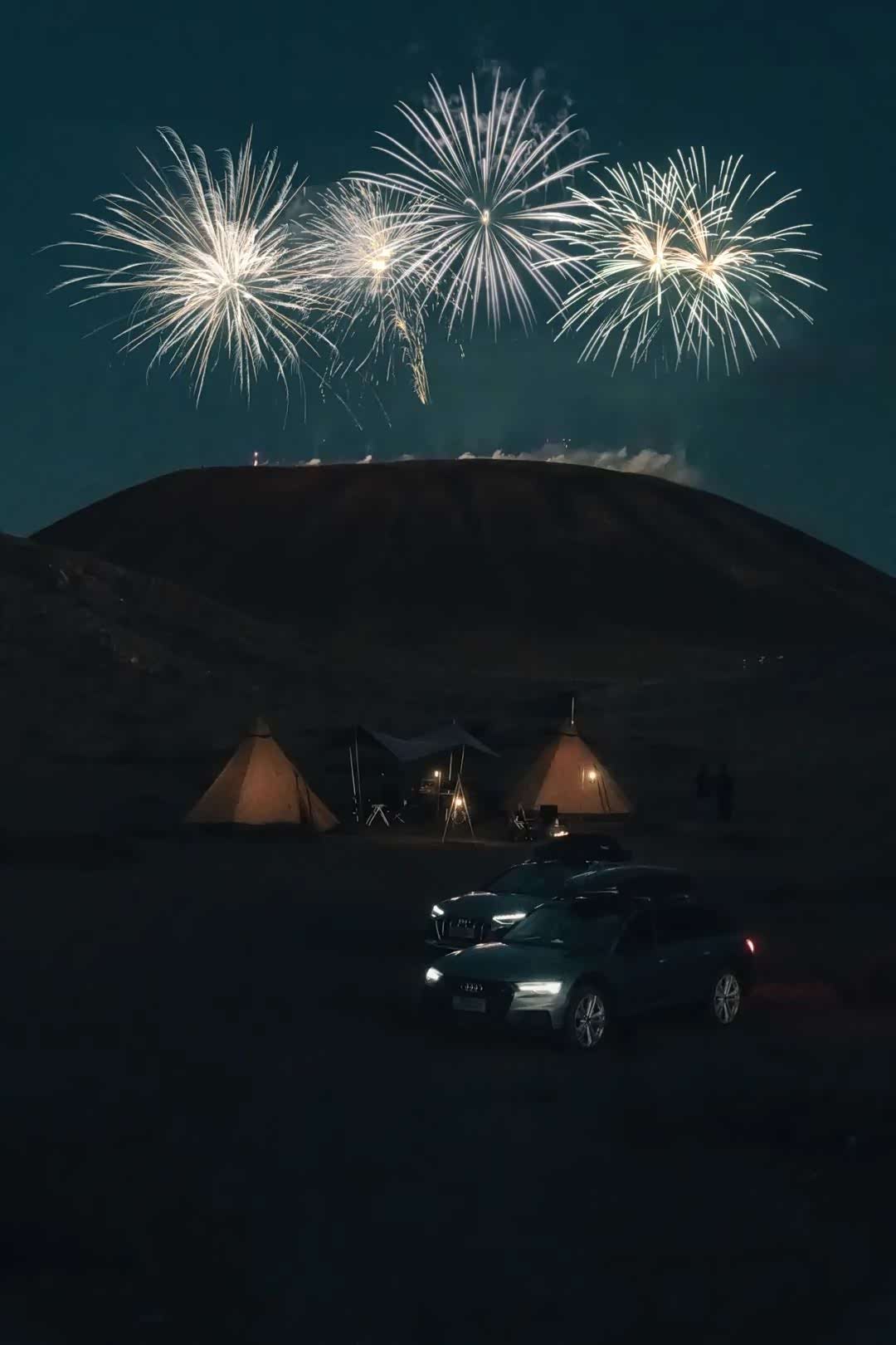 来到火山,只有露营似乎还缺点什么!资料记载,这里的上一次爆发是一万多年前。而此时,夜幕给了我们对火光的渴望。还有什么比在火山口来一场烟花秀,模拟一次火山爆发更酷的吗?