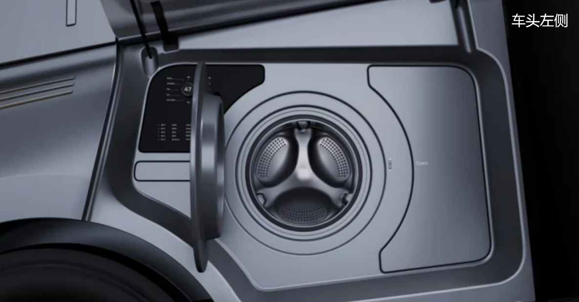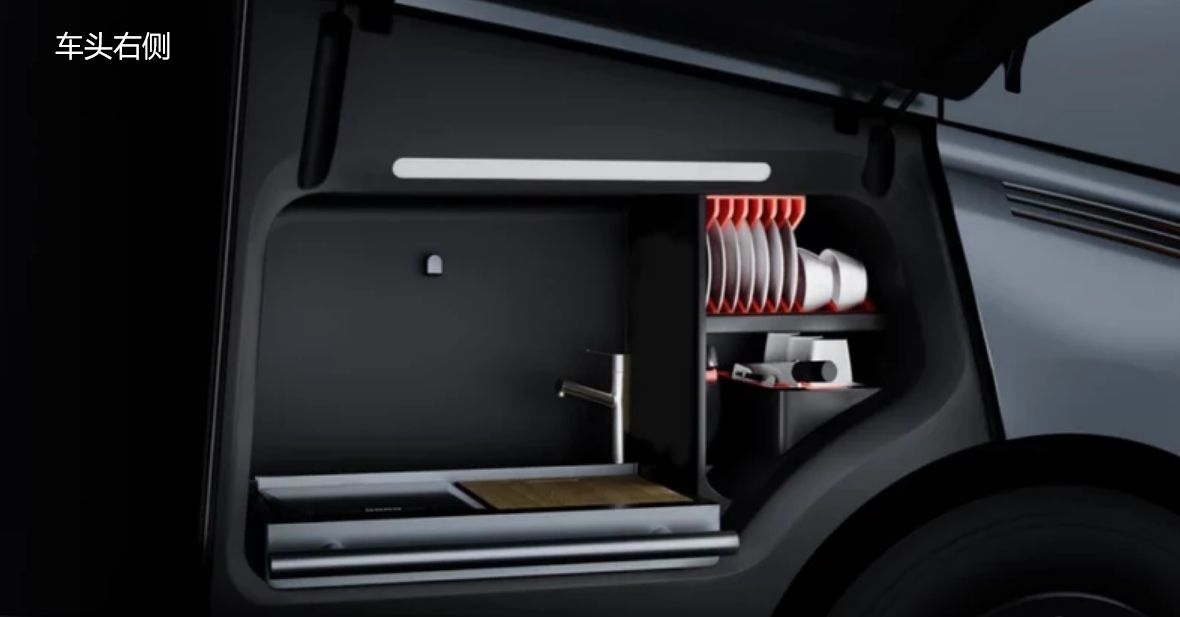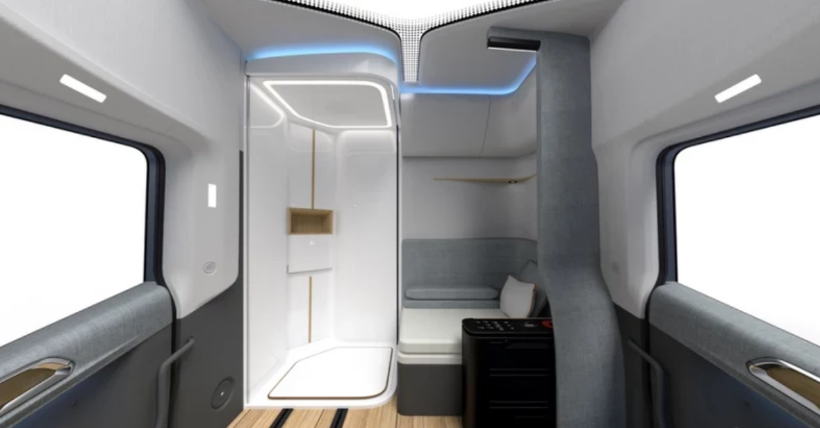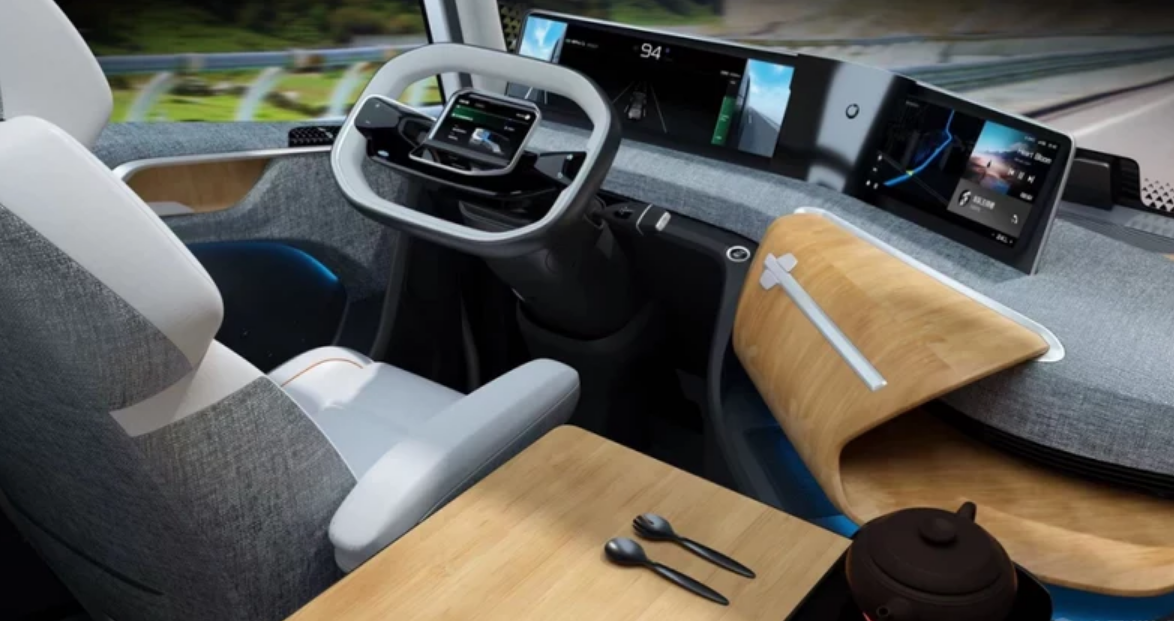车头外部已经可以看出很多炫酷的细节,量产车型将提供电子后视镜系统,左右两侧有全方位摄像头,将图像传输到车内屏幕上,这就能够避免恶劣天气对光学后视镜的影响。车头左侧位置掀开之后是带有烘干功能的洗衣机,跑长途的司机随时都可以换上洗干净的衣服。右侧位置打开之后是简单的折叠厨房系统,拥有灶台和案板,还有储存餐具的消毒空间。