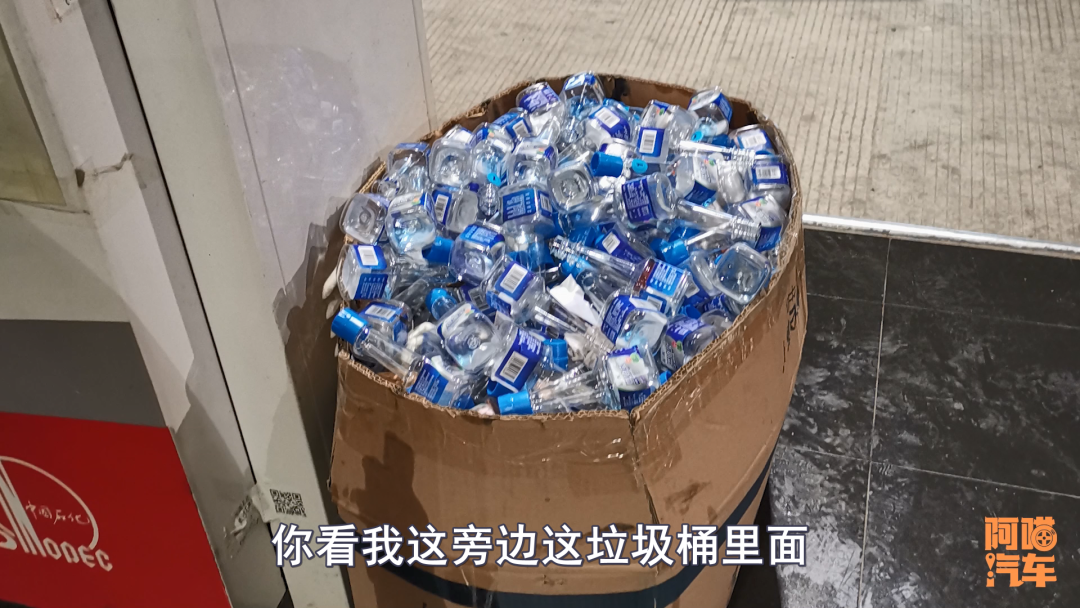 排气管发黑,但凡只要是使用石化燃油的内燃机,用一段时间之后,你去看一下,没有谁的排气管是绝对干净的,多多少少会有点黑色的物质,毕竟不可能做到百分百完全燃烧。如果你还在忐忑的话,他最后一招会告诉你,你看旁边这垃圾桶,满满一箱的瓶子,都是来我们加油站加油的客户用的,你看一天就卖了几百瓶,没一个投诉的,说明效果贼好。