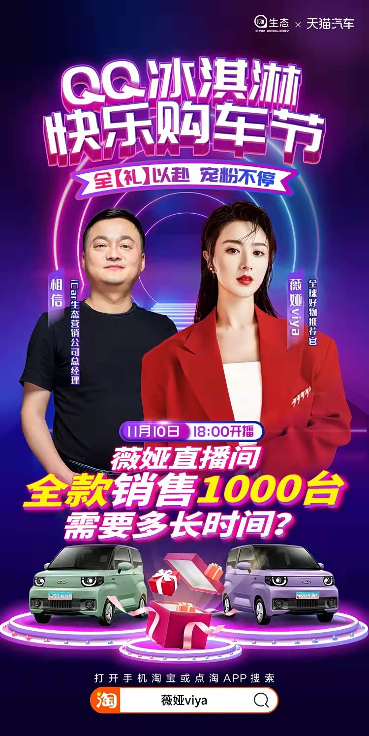 奇瑞汽车以天猫“奇瑞汽车官方旗舰店”为核心载体,打造多轮次、多场次线上电商营销活动,很豪横了。同时旗下iCar奇瑞新能源会在11月10日晚薇娅直播间,全款销售1000台QQ冰淇淋,或许将创造汽车电商新纪录。11月13日还将推出甜粉款车型,售价区间为5.99-8.39万元。