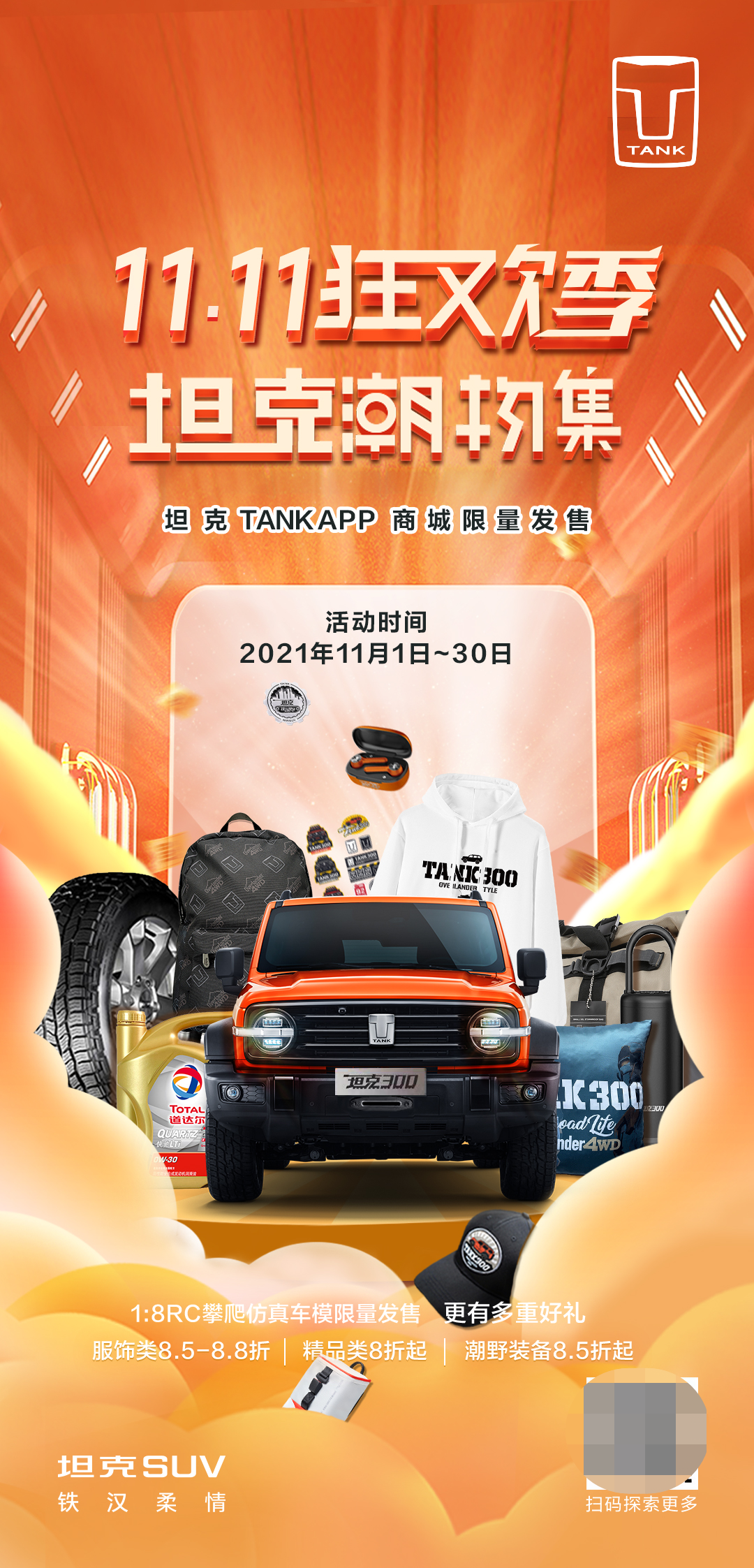 坦克品牌也不例外。11月1日-11月30日,坦克TANK APP商城好礼折扣优惠,坦克潮物集包括服饰类8.5-8.8折,精品类8折起,潮野装备8.5折起。