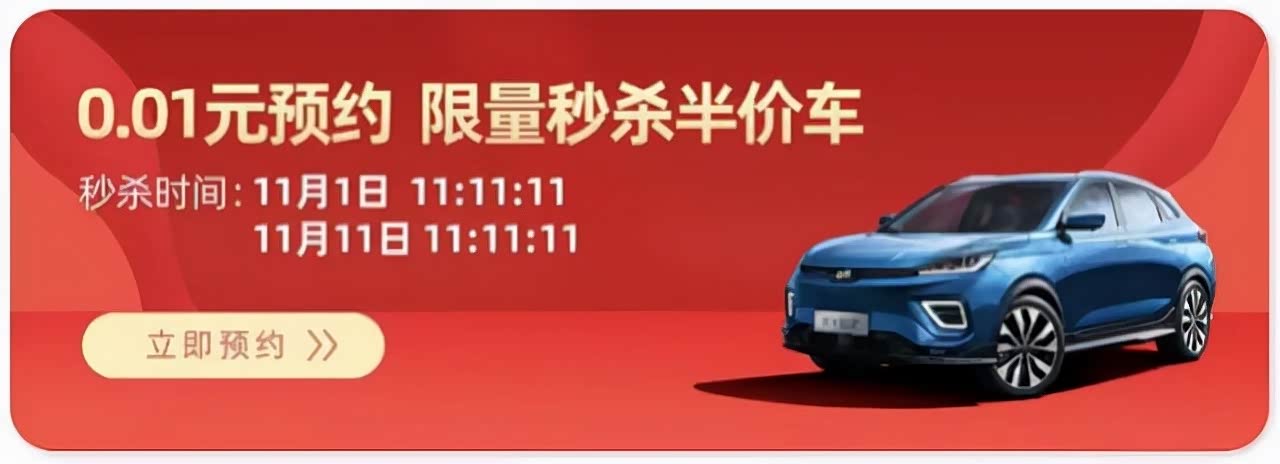 新能源汽车这么HIGH,自主品牌老大哥奇瑞也不甘落后:在固定时间半价秒杀,完成支付订金和个人信息确认后,最终在线下提车————这应该是双十一优惠力度最大的购车活动。