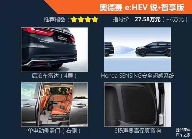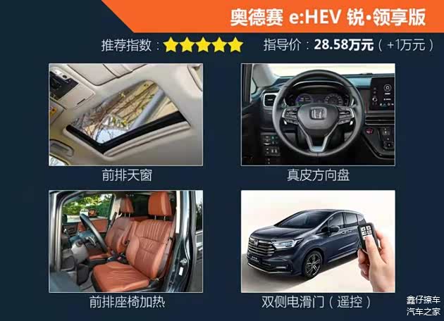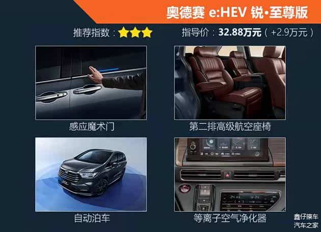 全系最高配的锐·至尊版车型,代表了奥德赛在舒适、安全、科技等方面的最高水平,配置上自然相当全面。科技感满满的感应魔术门在新奥德赛上依旧没能得到下方,为顶配专属。外部全方位的雷达以及感应探头让这台锐·至尊版可以实现自动泊车、后方来车预警、并线辅助、360°全景影像等功能,让驾驶一台MPV变得更加方便。对于全车的乘客来说,前排大尺寸扶手、后排高级电动航空座椅和等离子空气净化系统,让乘坐感受更舒适、车内空气更清新。同时远程启动发动机(空调)功能,能够让车内提前到达适宜的温度,进一步提升乘坐体验。但32.88万元的售价,还是需要你“咬咬牙”的。