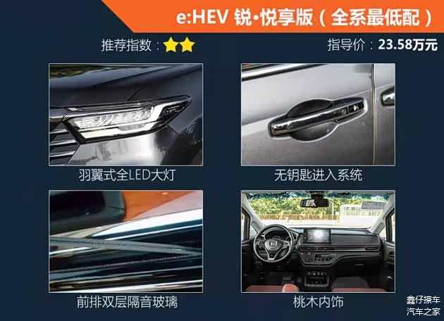 从与低配车型4万的差价上来看,大家就不难想到,这款次低配的锐·智享版车型的配置一定不会低。果不其然,在低配车型上缺失的一些实用配置,在锐·智享版车型上都补齐了。除了上述图中介绍的配置,实用配置上增加了前排中央储物盒、烟灰缸。舒适配置增加了真皮座椅、感应式电尾门。科技配置上,倒车影像、娱乐系统、Honda CONNECT 3.0智导互联系等等,可以说是全方位弥补了底配车型的不足,多花4万元还是非常值得的。那既然这么值,为什么还不是最推荐的车型呢?我们往下看!