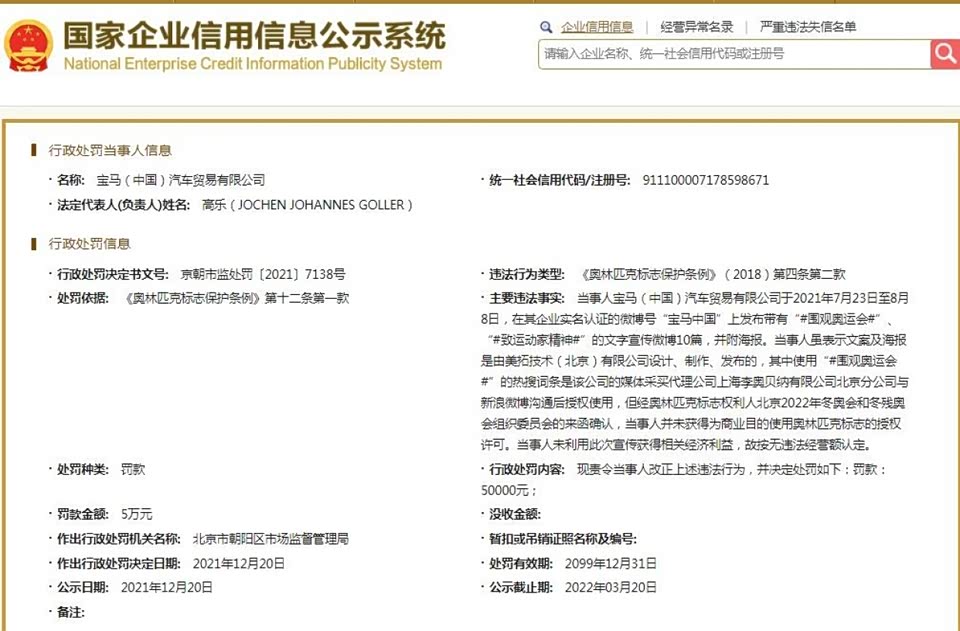 【商用奥林匹克标志违法 宝马(中国)被处罚款5万元】关信息显示,因商用奥林匹克标志,宝马(中国)汽车贸易有限公司被罚5万元。据悉,国家企业信用信息公示系统网站中一则处罚信息显示,宝马于2021年7月23日至8月8日,在其企业实名认证的微博号“宝马中国”上发布带有“#围观奥运会#”“#致运动家精神#”的文字宣传微博10篇,并附海报。宝马方面虽表示文案及海报是由美拓技术(北京)有限公司设计、制作、发布的,其中使用“#围观奥运会#”的热搜词条是该公司的媒体采买代理公司与微博沟通后授权使用。经奥林匹克标志权利人北京2022年冬奥会和冬残奥会组织委员会的来函确认,当事人并未获得为商业目的使用奥林匹克标志的授权许可。当事人未利用此次宣传获得相关经济利益,故按无违法经营额认定。北京市朝阳区市场监督管理局责令宝马(中国)改正上述违法行为,并处以罚款5万元。