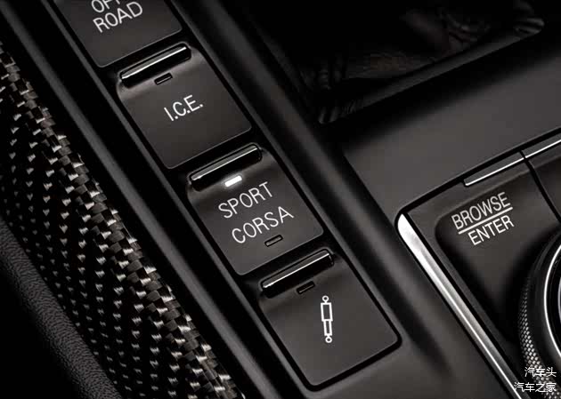 内饰部分,整车的造型简洁运动,用料方面也很豪华,中控台上还配备了钟表,体现了高性能的身份。下面是指针式仪表盘,中间是小块液晶屏,多媒体大屏幕内嵌在中控上,尺寸为8.4英寸,两侧是空调出风口,下方设计了实体按键,用来操控空调,底部的电子换挡机构很时尚,碳纤维材质的内饰也提升了整车的质感。新车标配自适应空气悬架、后桥机械式限滑差速器、主动扭矩控制系统、驾驶稳定程序等操控配置。