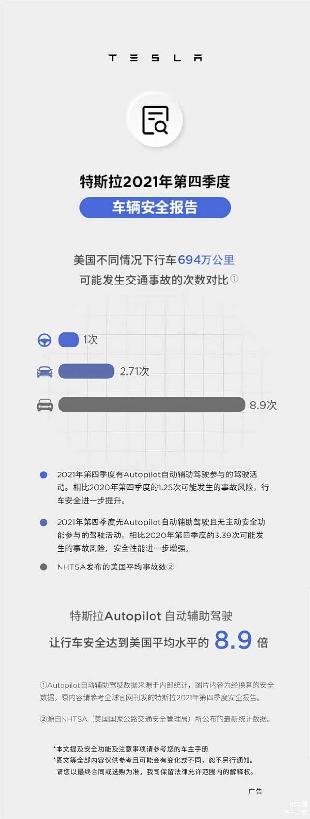 相比之下,根据美国国家公路交通安全管理局(NHTSA)最新发布的数据,美国平均每431英里(约合694万公里)的行驶里程中会出现8.9起交通事故,可见在Autopilot自动辅助驾驶系统的辅助下,特斯拉的行车安全水平为美国平均水准的近9倍。
