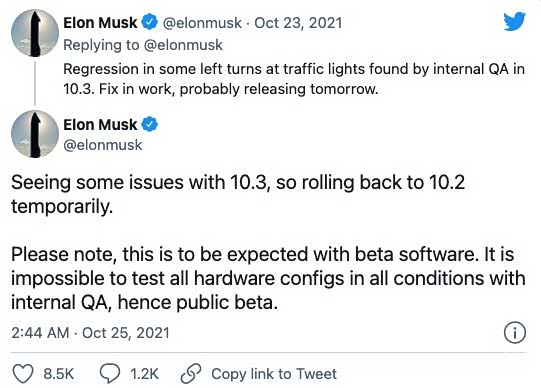 而特斯拉FSD无论是早期的测试版本还是后续推送的版本也存在着不少问题。在去年10月份,特斯拉推送的10.3版本的FSD Beta软件就曾因导致通信错误引起的前置防撞报警器误报警,使得系统一度退回到了10.2。不仅如此,由于NHTSA介入调查,特斯拉最后因为该事件召回了1.2万辆汽车。
