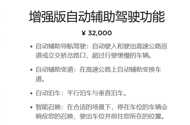 根据特斯拉的介绍,Autopilot分为“基础款”和“增强版”两个类,其中基础版为标配,可以实现车辆的自适应巡航以及车道保持功能,而增强版则需要选装,国内选装需要32000元,具有L2级别的辅助驾驶功能。